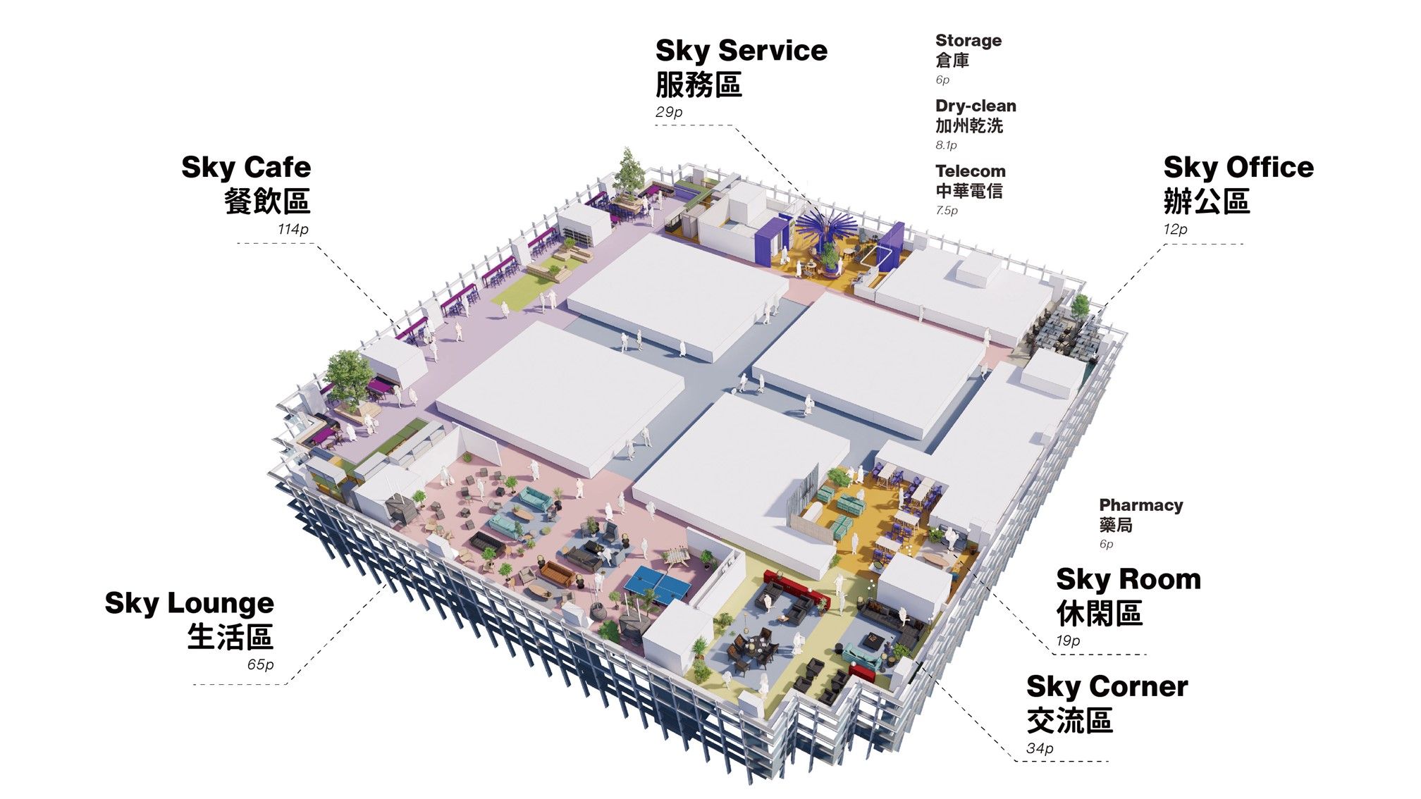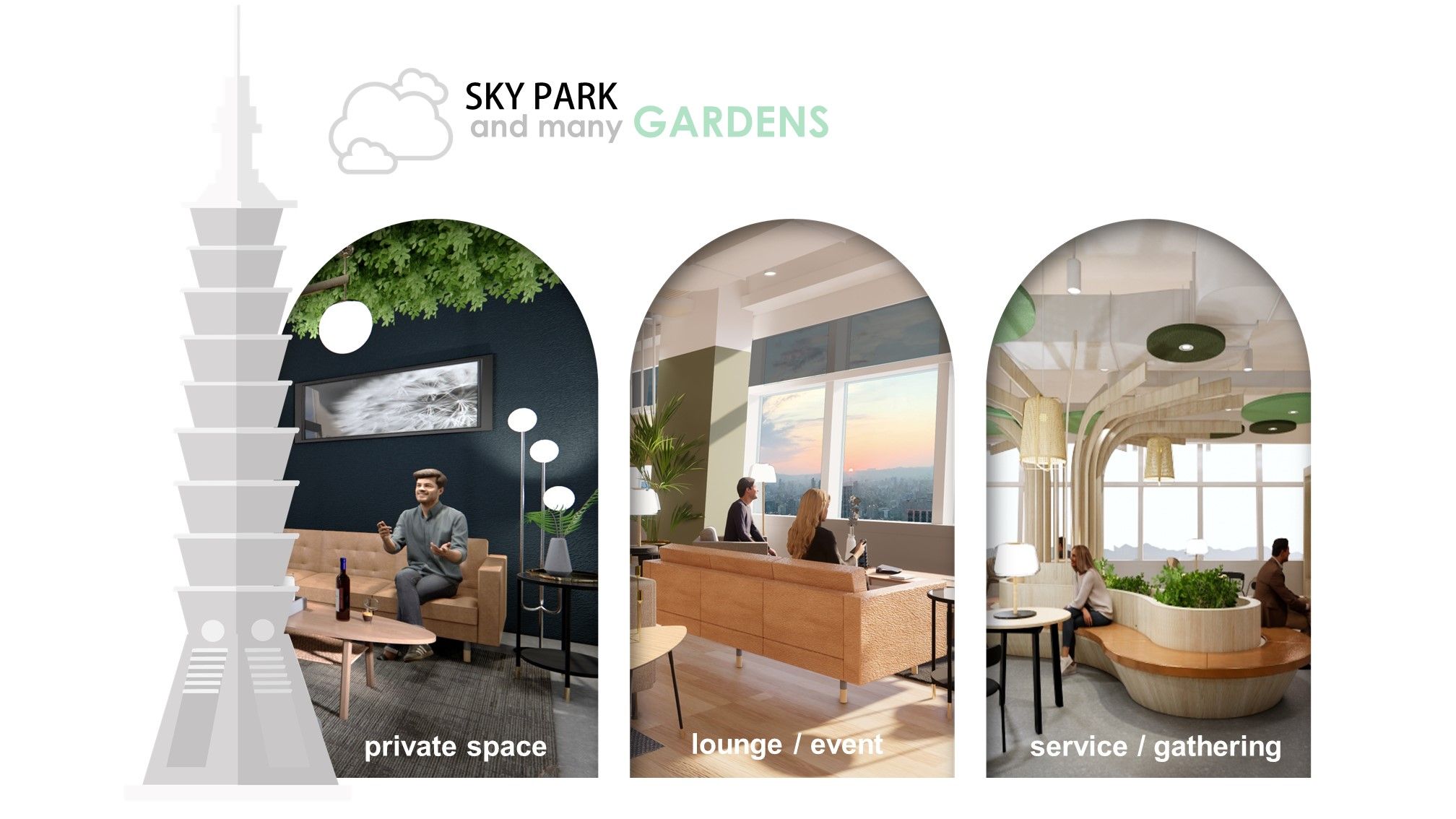 In order to provide the occupants with better services and convenience, there are two major considerations in the planning of Sky Park, one is safety control, and the other one is to improve the living functions of the tenants. Previously, there were many restaurants and tourists on the 35th floor, and it was hard to control the flow of people. In order to allow tenants to have a more private and secluded space to rest, the building safety was the first consideration. Re-planned and built to provide convenience, services such as coffee, 7-11, laundry, and telecom operators were introduced.