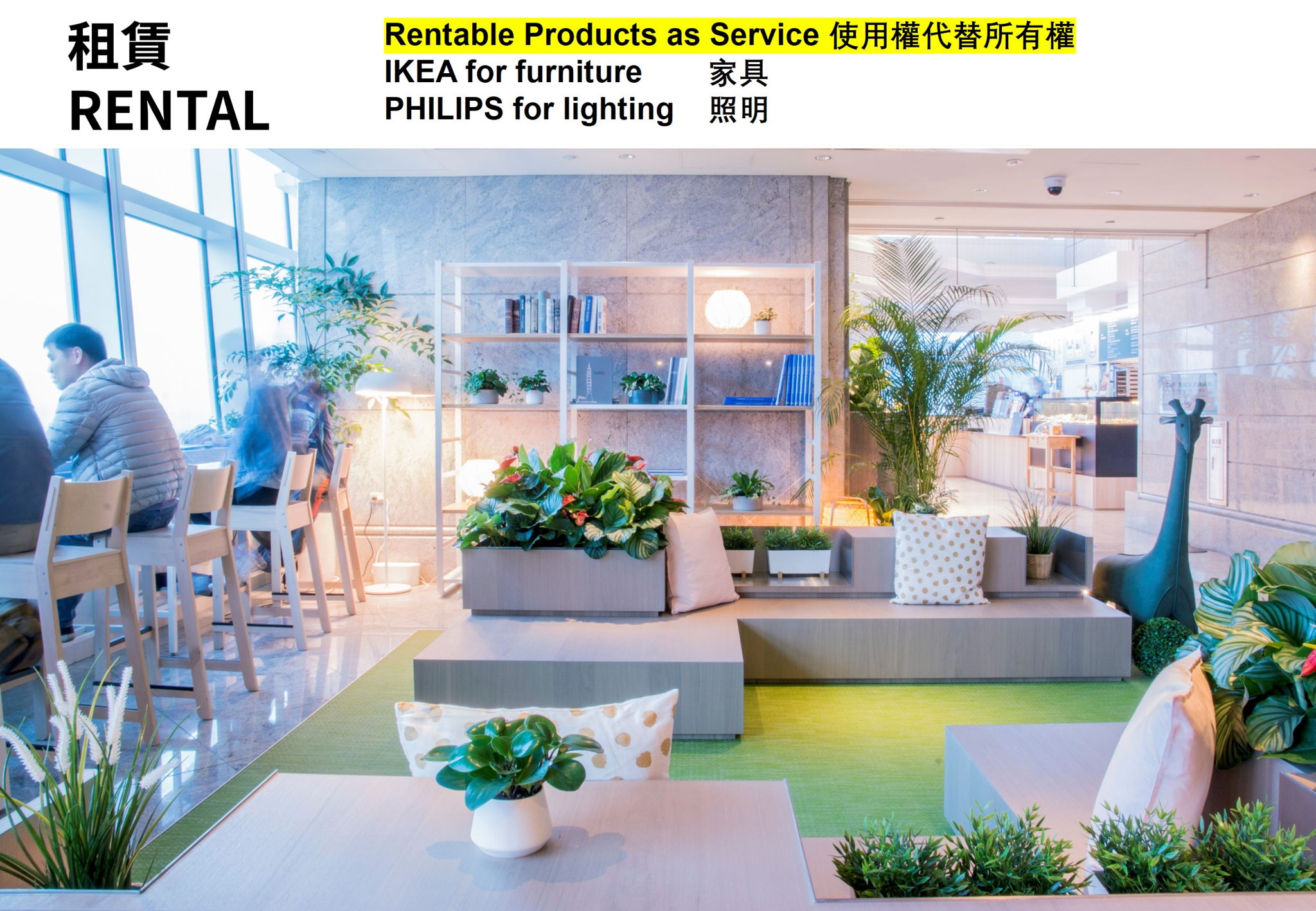 In addition, we implemented the "rental and purchase" service on the 35th floor of furniture (IKEA), lamps (Philips), and plants (floral space). Manufacturers provide the furniture and products required by Taipei 101, regularly inspect, repair and replace them, breaking the traditional furniture "manufacturing-buying-using-discarding" model, and instead opting for the “product as a service” concept of a circular economy.