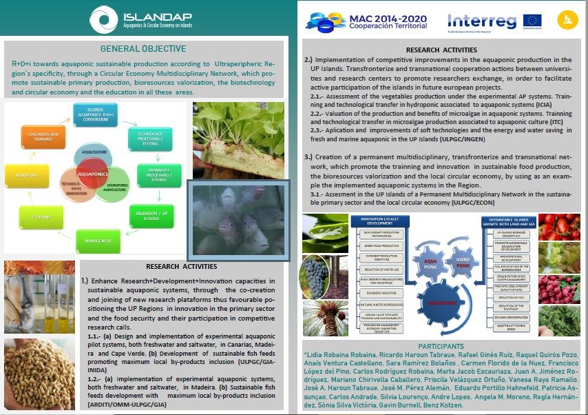 “R + D + i TOWARDS AQUAPONIC DEVELOPMENT IN THE UP ISLANDS AND THE CIRCULAR ECONOMY. INTERREGIONAL FORWARD CHALLENGES-ISLANDAP ADVANCED” is a project belonging to the INTERREG V-A MAC 2014-2020 Program (International Cooperation Operational Program) and financed by the European Regional Development Fund. Its global strategic objective is to obtain significant and tangible progress in transnational cooperation with the objective of favoring the cohesive, sustainable and balanced territorial development of the Atlantic Area and its maritime heritage.