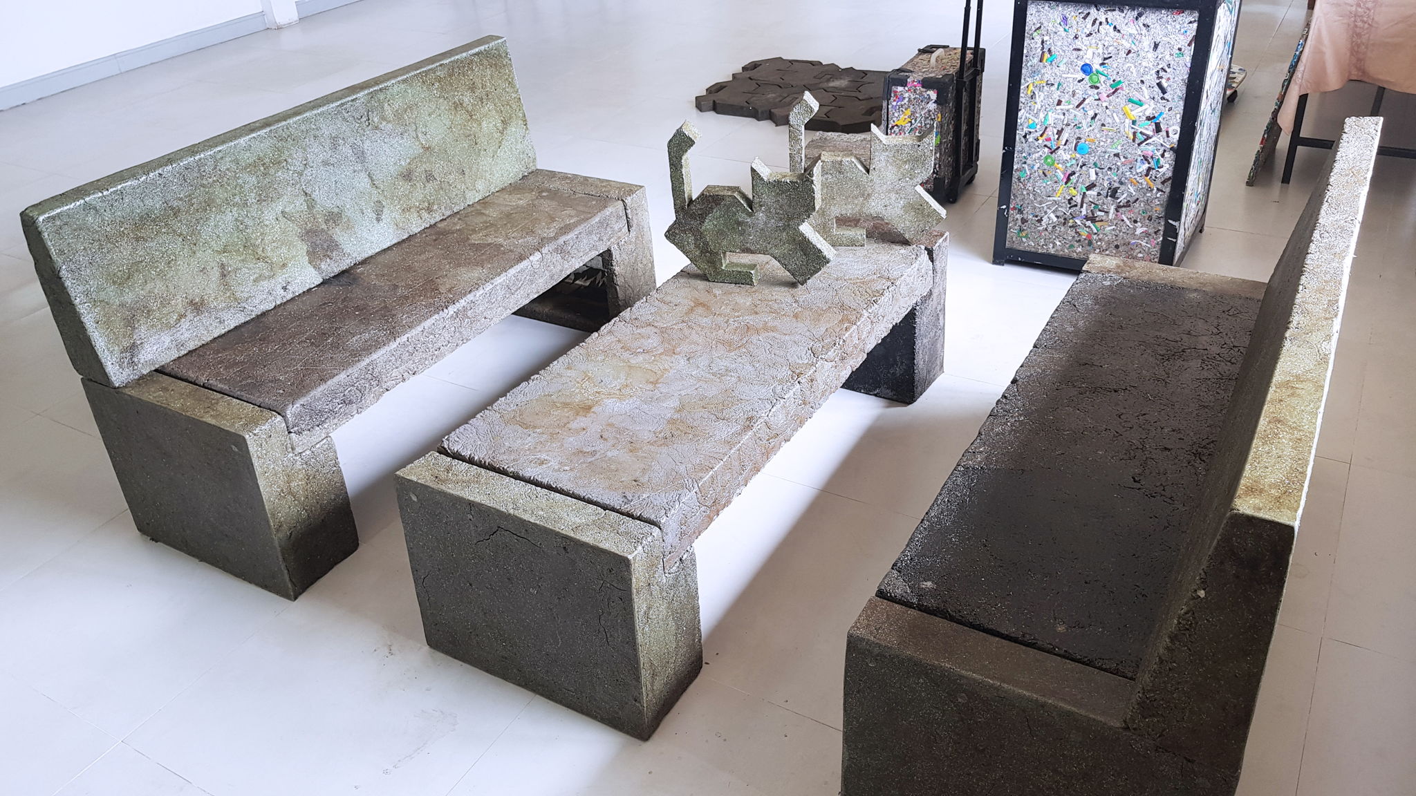 Upcycled plastic products made from 100% plastic waste without adhesives, e.g., floor blocks, desks, garden benches, and garbage bins.