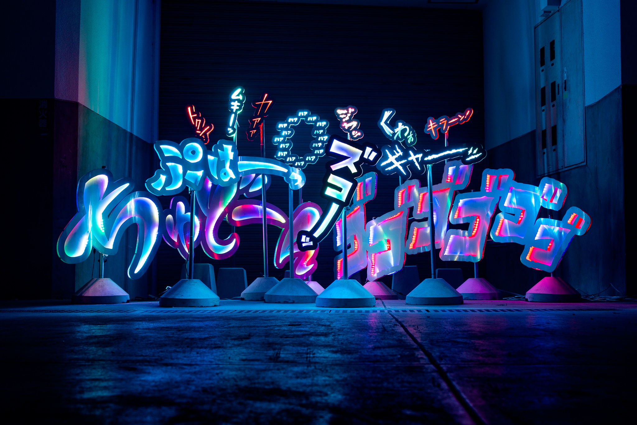 文字があったらソコで撮る!少年誌でよく見かける「ゴゴゴゴ」、ホラー漫画に代表される「ギャーッ」、ときめきの「トクン」など、そんな発光する擬音文字がイルミネーション会場に散りばめられていたらどうだろう。参加者はどんなポーズで表現するんだろうか。説明不要の大喜利イルミネーション。(全13種類)