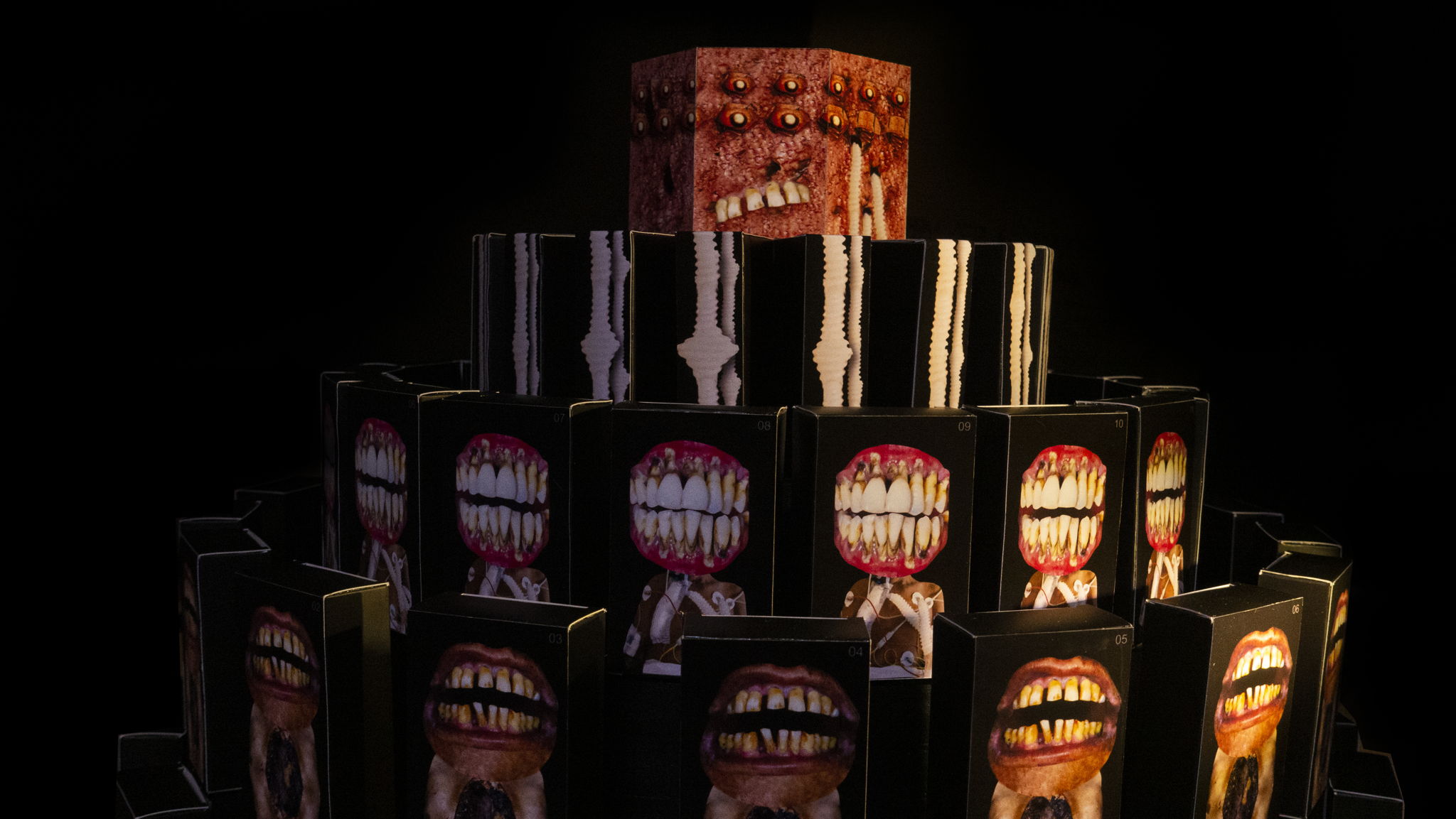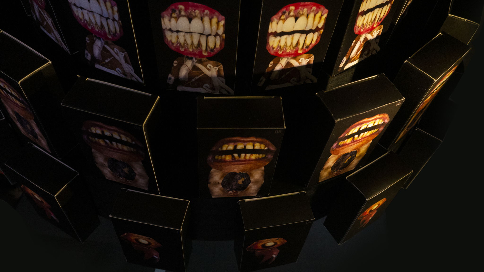 This work consists of 80 cigarette packs installed on 5-level round base driven by a motor and there is a light sensor, 7 segment, LED, and Arduino.