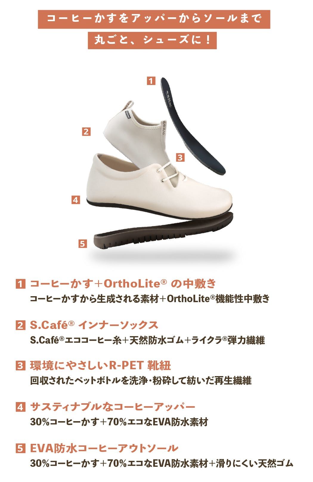 コーヒーかすの優れた消臭や除湿効果に着目し、防水や耐滑効果などの機能面も充実させてより快適な履き心地と洗練されたデザインのシューズを制作しました。