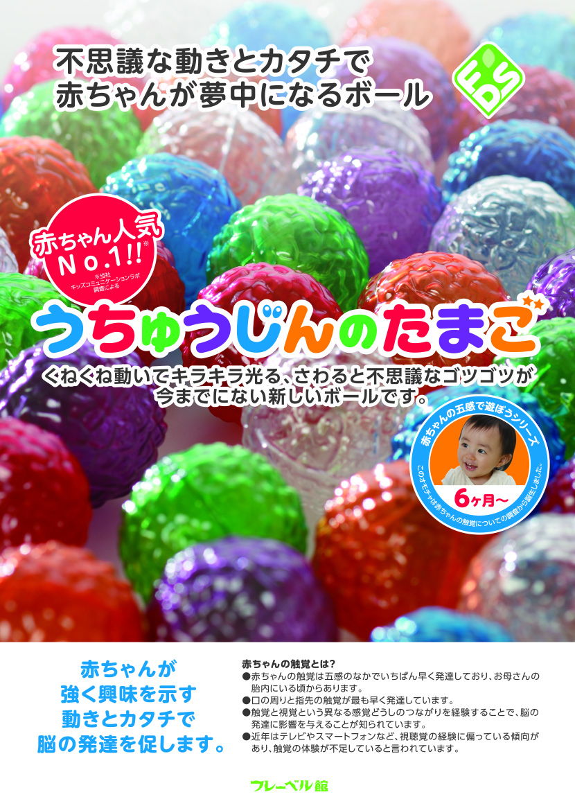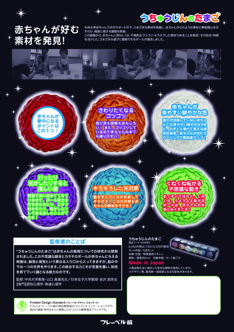 赤ちゃんが好きな素材は「ふわふわしたもの」「やわらかいもの」「パステル調の色のもの」……。これって本当でしょうか?中央大学教授・山口真美先生、日本女子大学教授・金沢創先生監修のもと、 0~1歳の赤ちゃんを対象にさまざまな素材を提示し、その反応(接触時間・行動観察)を独自調査。従来の乳児向け玩具に多い素材とは異なる【不規則なゴツゴツ、鮮やかな色、光を反射】に強い興味関心を示す意外な結果が得られました。この素材を活かしたボールとして「うちゅうじんのたまご」は誕生。きらきら光ってうねうね動く、今まで見たこともないような形状をしていたことからこのネーミングになりました。