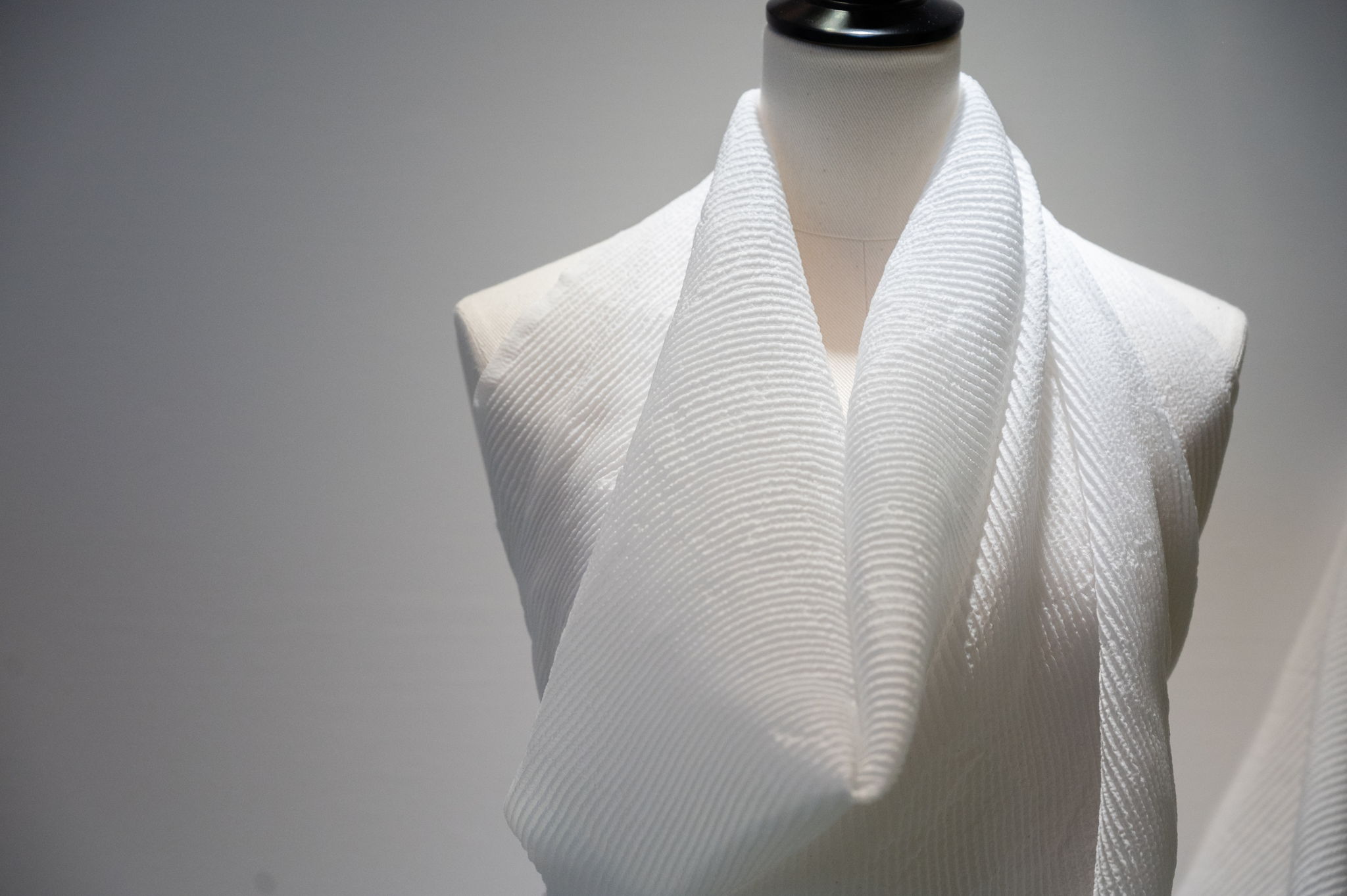 これらの緻密な技術は絹以外のマテリアルに転用することが可能であり、アレンジして組み合わせることで、織物素材に伸縮性や多層構造といった機能を付与することができます。今回はこれらの技術をバイオマスプラスチック糸に応用し、強く撚った糸でバイアス柄を二重織りすることで、プリーツ構造と伸縮性を表現しました。