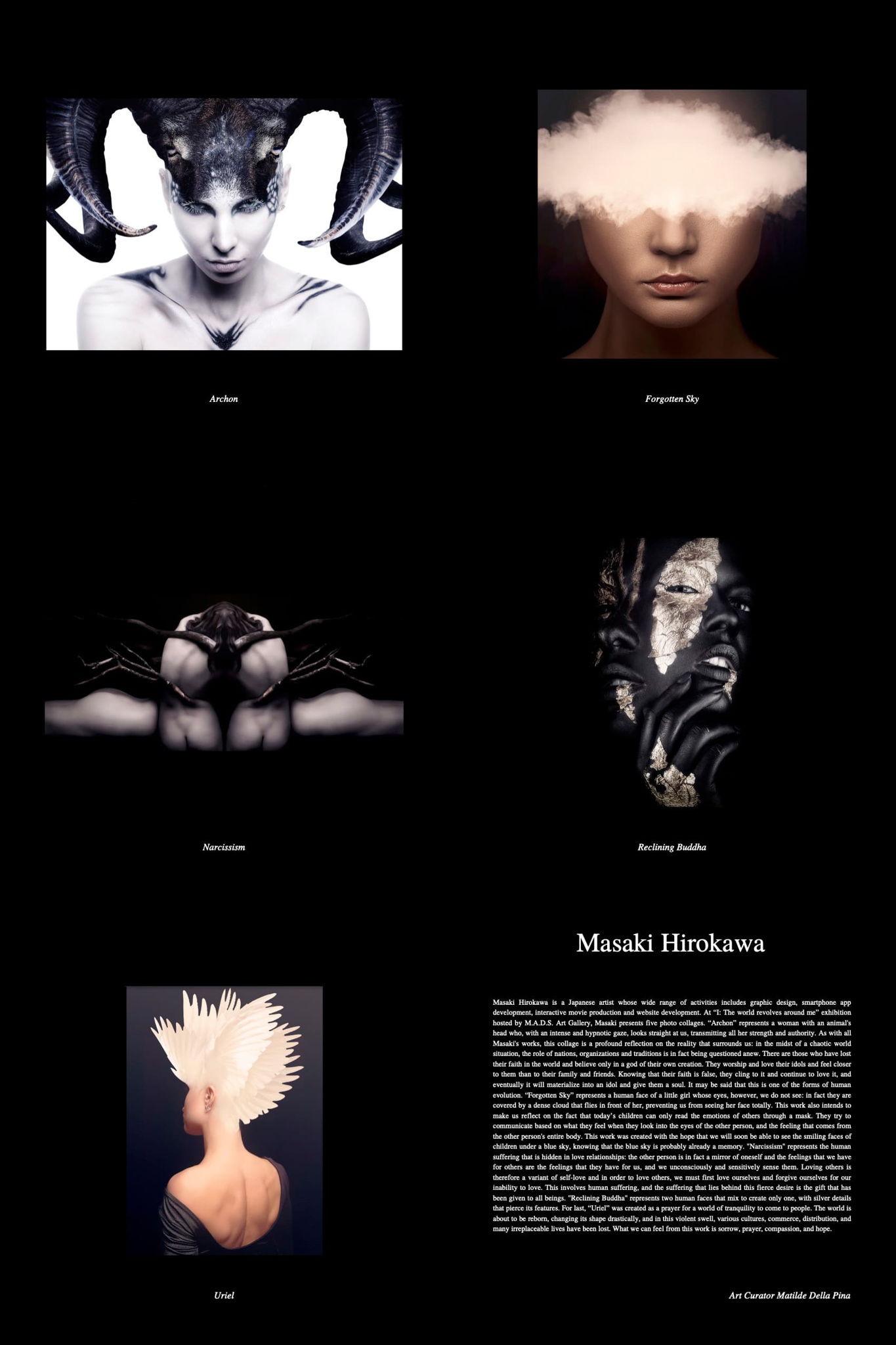 Masaki Hirokawa is a Japanese artist whose wide range of activities includes graphic design, smartphone app development, interactive movie production and website development. At “I: The world revolves around me” exhibition hosted by M.A.D.S. Art Gallery, Masaki presents five photo collages.