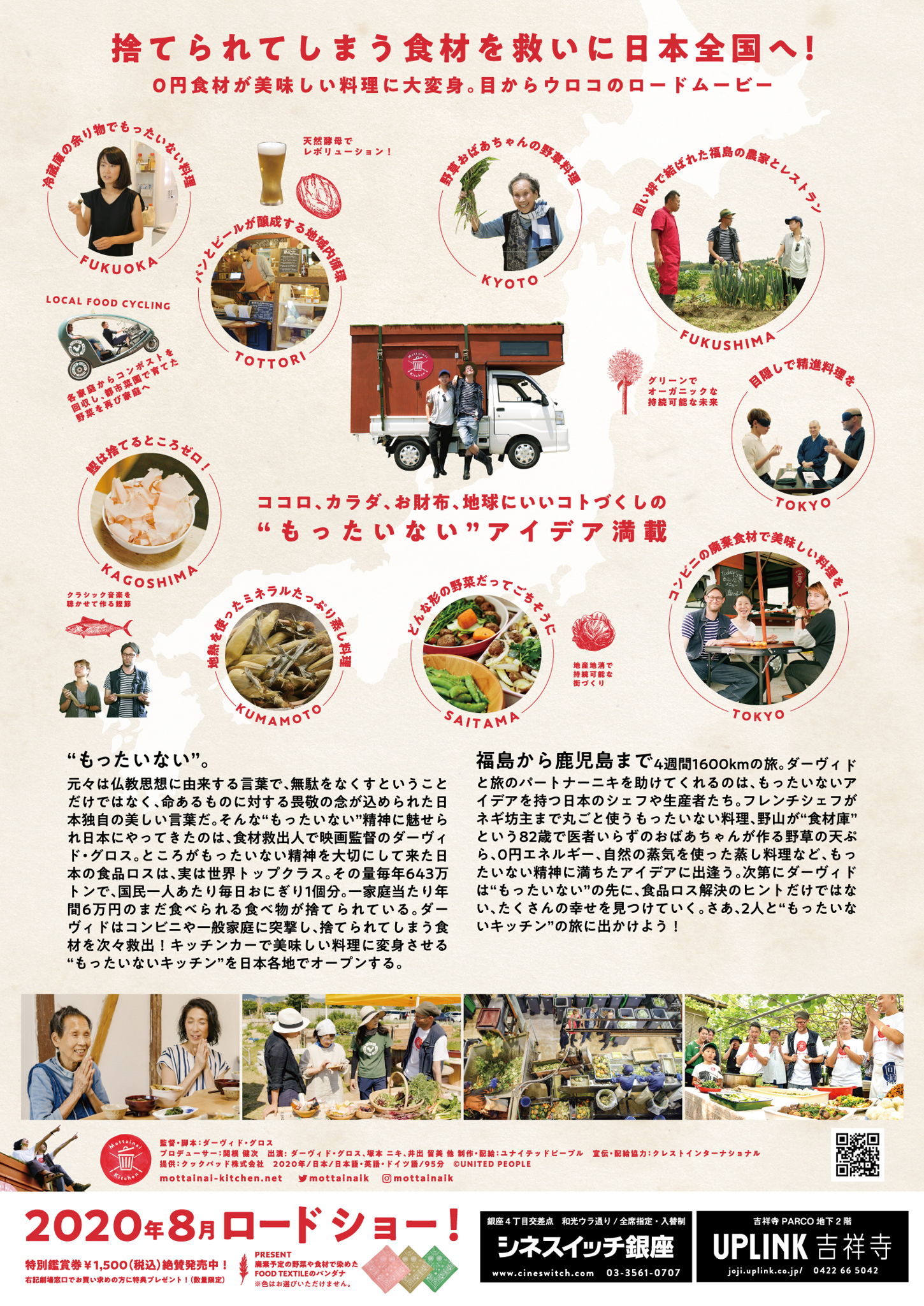 オーストリア出身のダーヴィド・グロス監督がヨーロッパを舞台に制作した映画『0円キッチン』は、世界で生産される食料の3分の1が捨てられていることを知った監督自身が、捨てられてしまう運命の食材を各地のシェフとコラボレーションして美味しい料理に変化させ、食品ロス問題の解決を明るく楽しく実践したエンタメロードムービーです。この作品をユナイテッドピープルが配給したことから、代表の関根健次とダーヴィドが出会い、意気投合し、日本を舞台に映画『もったいないキッチン』を制作しました。それは、日本でも量に例えたら、毎日1億個以上のまだ食べられるおにぎりが捨てられているという食品ロス問題を知ったからです。前作と異なる点は、食品ロス問題のみならず未利用の自然エネルギー資源やプラスチック問題解決など、サステナブルな未来のヒントを幅広く紹介したことです。その鍵として映画の軸としたのが、日本が古来から大切にしてきた"もったいない精神"です。廃材を使いアップサイクルして制作したキッチンカーで、ダーヴィド達が日本全国を旅して、未来をよりサステナブルにする革新的な“レシピ”を次々と紹介する、見たら行動したくなる映画となっています。