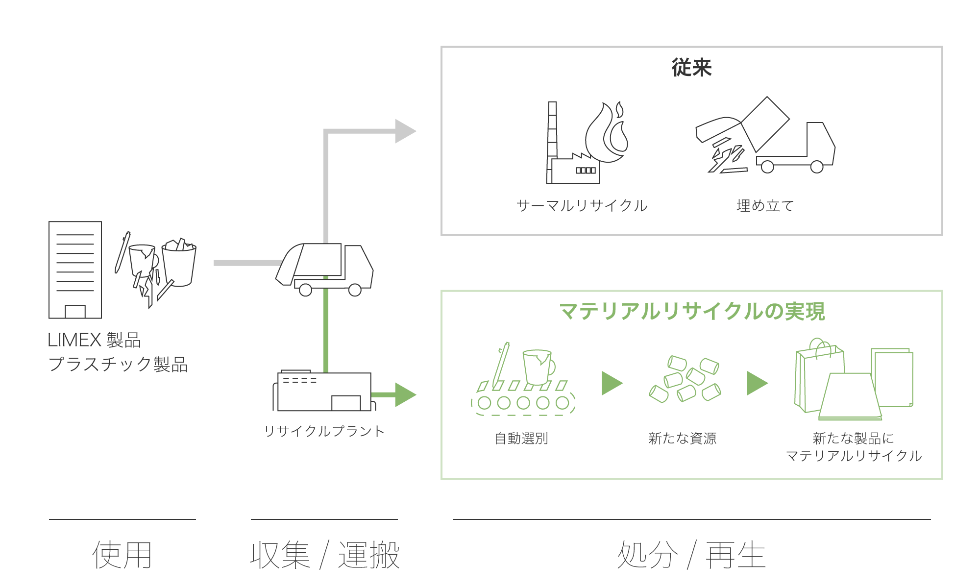 この「MaaR」と、2022年秋に神奈川県横須賀市内で竣工予定の国内最大級のマテリアルリサイクルプラント(自社プロデュース)を通じ、使用済みLIMEX製品を含むプラスチック使用製品のマテリアルリサイクルを促進し、サーキュラーエコノミーの文化形成を目指します。
