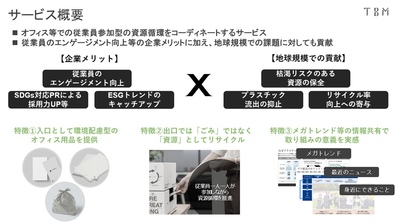 弊社(株式会社TBM)は資源循環サービス「MaaR(マール)」を2022年3月末に発表しました。TBMは、プラスチックの代替となる、石灰石などの無機物を主原料とした新素材「LIMEX」を開発・製造・販売しています。「MaaR」は、使用済みのLIMEX製品やプラスチック製品の資源循環をコーディネートする一般消費者・事業所向けサービスです。第1弾として、オフィスなどの事業所を対象とした法人向けの資源循環サービス「MaaR for business(マール・フォー・ビジネス)」の提供を開始しています。導入企業のオフィスで使用されたLIMEX製品やプラスチック製品を回収し、導入企業にはオフィスで活用可能な環境配慮型製品に交換できるチケット付与や環境意識醸成に繋げる教育資料の提供を行う月額制のサービスです。