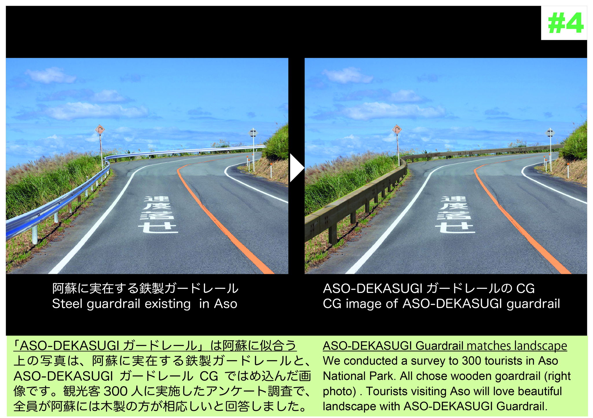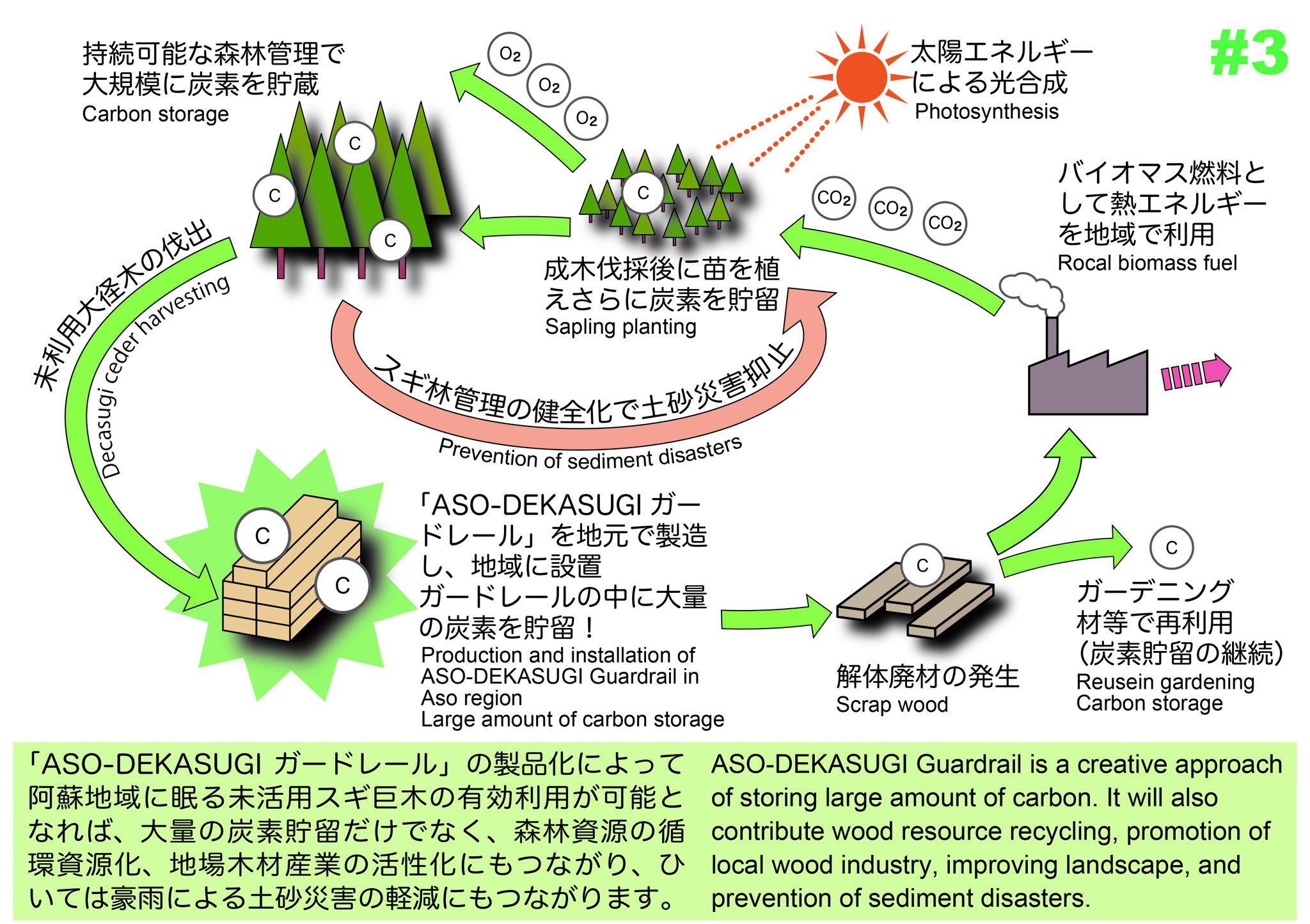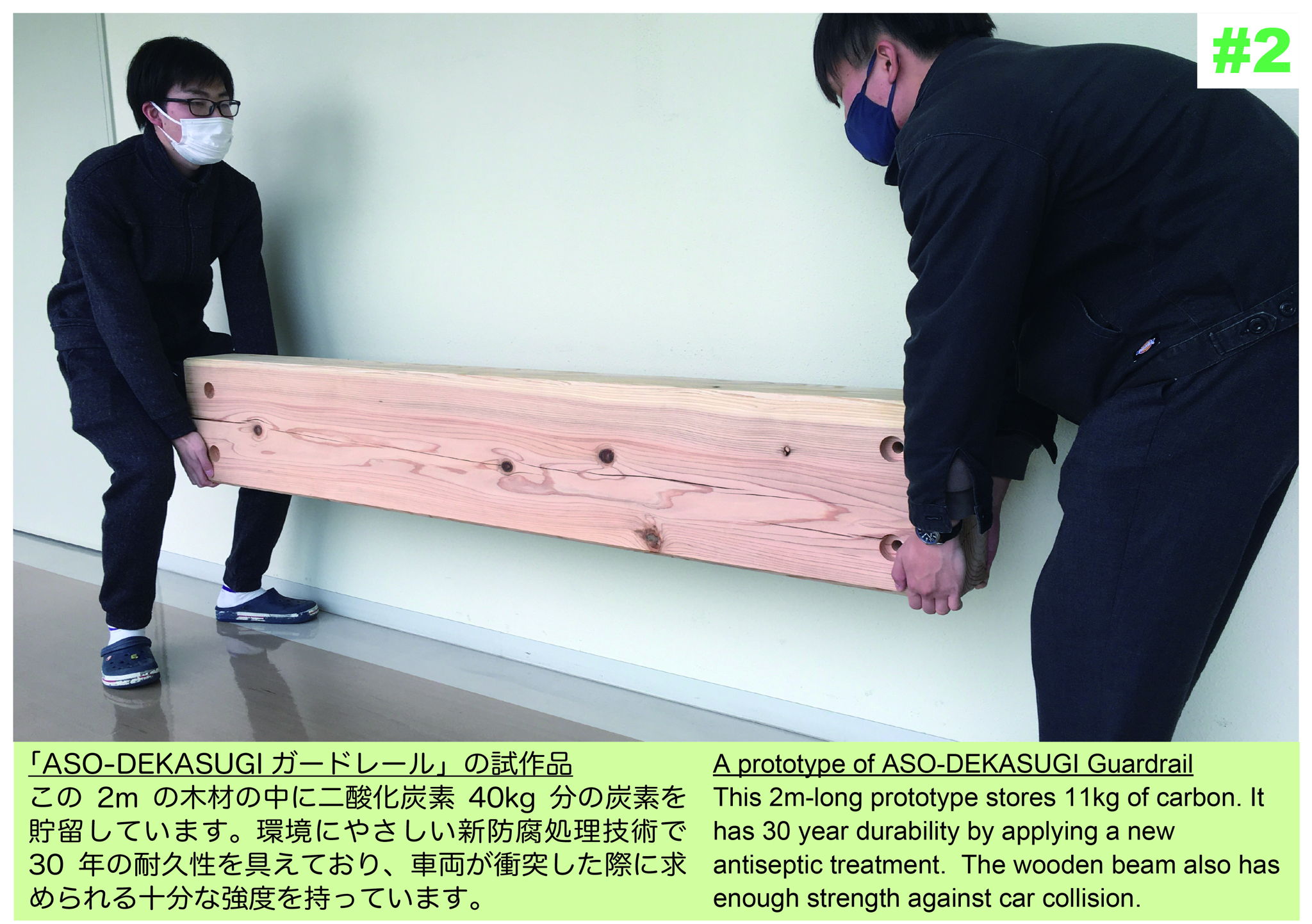 阿蘇地域に未利用のまま無数に存在している巨大なスギを、地域循環資源として土木公共事業の分野で活用することにより、地球温暖化抑制に貢献する炭素貯留の促進、地場林業の活性化、観光地としての阿蘇の景観改善、そして豪雨に伴う土砂災害の抑制を目指しています。そのアウトカムの一つが「ASO-DECASUGIガードレール」です。パートナーは地元の阿蘇森林組合です。