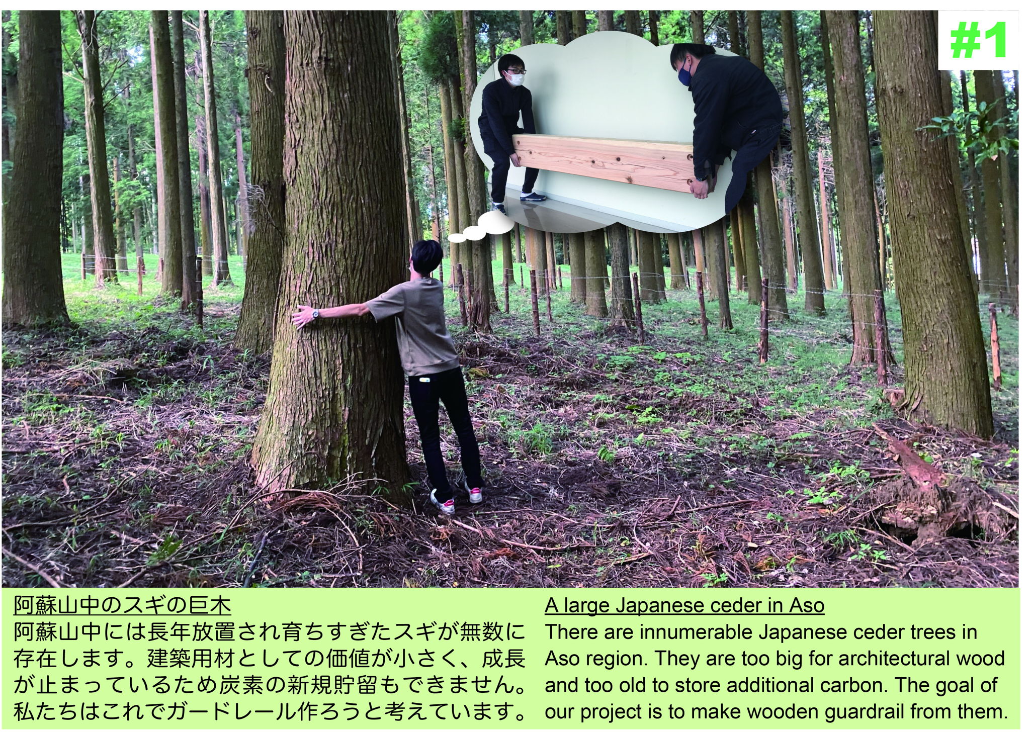 Our idea is to utilize these overgrown cedars for road guardrails. Most guardrails are made of iron. In the process of making 1 ton of iron, 2 tons of CO2 are emitted. If you install a 1km-long guardrail made of cedar, you can store 20 tons of carbon in it. If you plant tree seedlings after cutting down cedar trees and rotate the cycle of wood resource recycling, you will store a large amount of carbon even in the process of growth. The warm texture of wooden guardrails matches well with the beautiful Japan landscape.