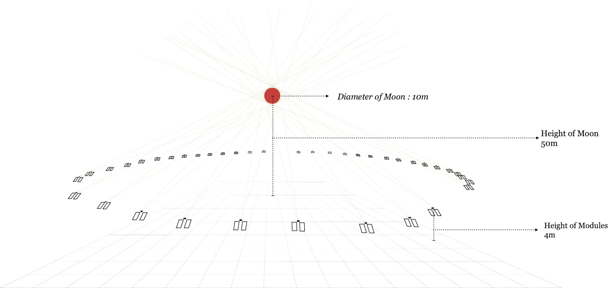 The artists have frequently used the motif of the moon as a reflection of our physical reality. It is the only land that we can naturally see outside of our own habitat, and demonstrates the physicality of our planet Earth, as a spherical body traveling alone through space, awakening and disappearing as the sun's shadow is passed around it. By presenting an immaterial moon, the work monumentalises a merging of virtual and physical realities. This motif relates to the moon of Haruki Murakami's 1Q84 which demonstrates the viewer entering into a new reality.