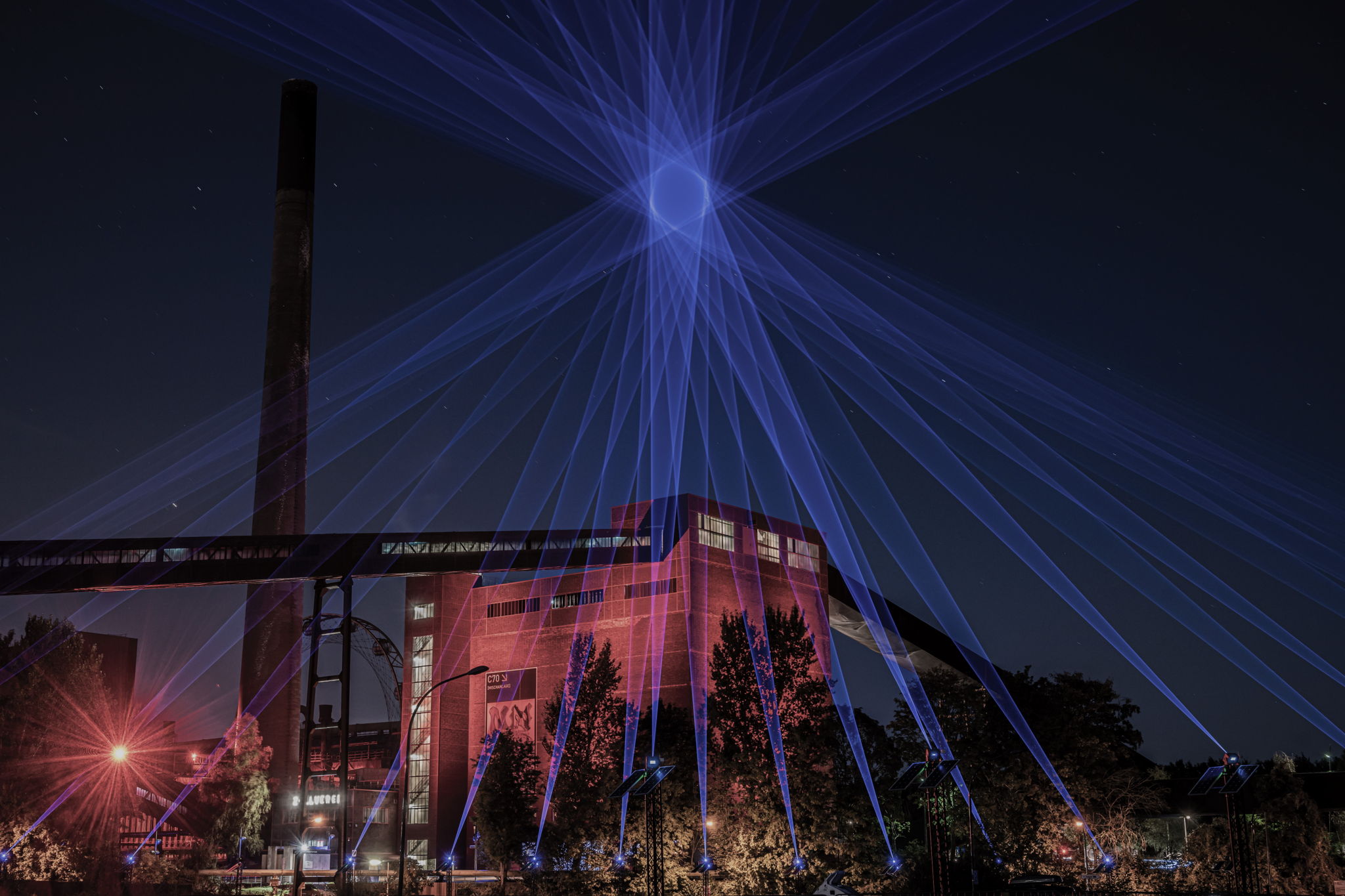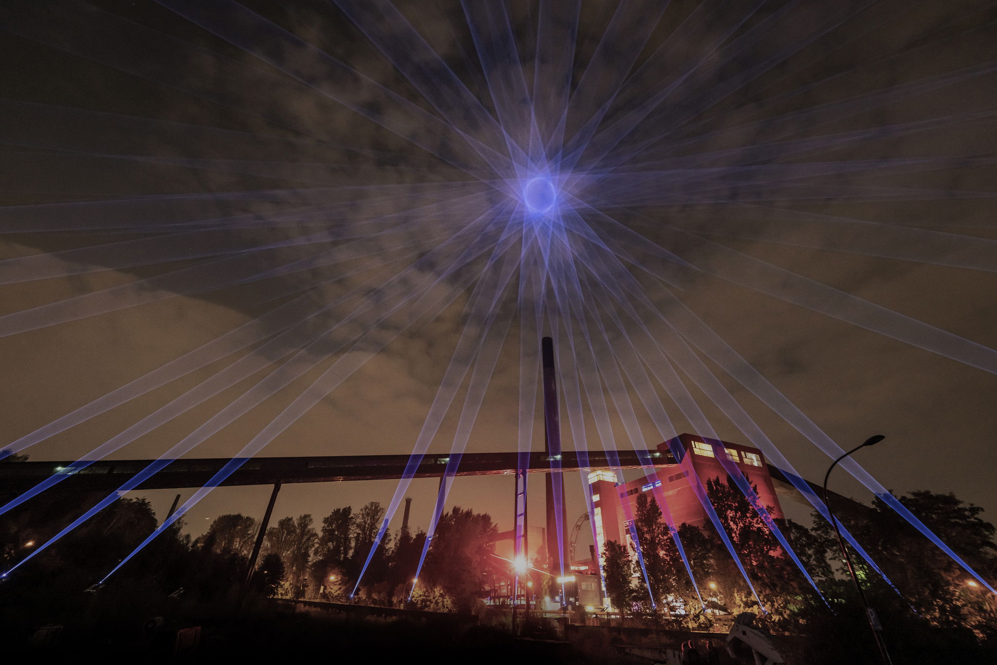 The project was first presented in the industrial ruins of the Zeche Zollverein (historically the most productive coal mine in Europe). Each night the lasers turn off one by one as the sunshine on that particular day is depleted from their batteries. This mechanism replays the ephemeral energy of the day, unwinding our on-demand instinct for energy which became dominant during the era of fossil fuels. The work proposes that our relationship with energy could be more like our relationship with internet bandwidth, where one day the energy is fast (when the sun and wind are available) and the next might be slow, and that by learning to live in this world of fast and slow energy we can significantly reduce our dependency on fossil fuels.