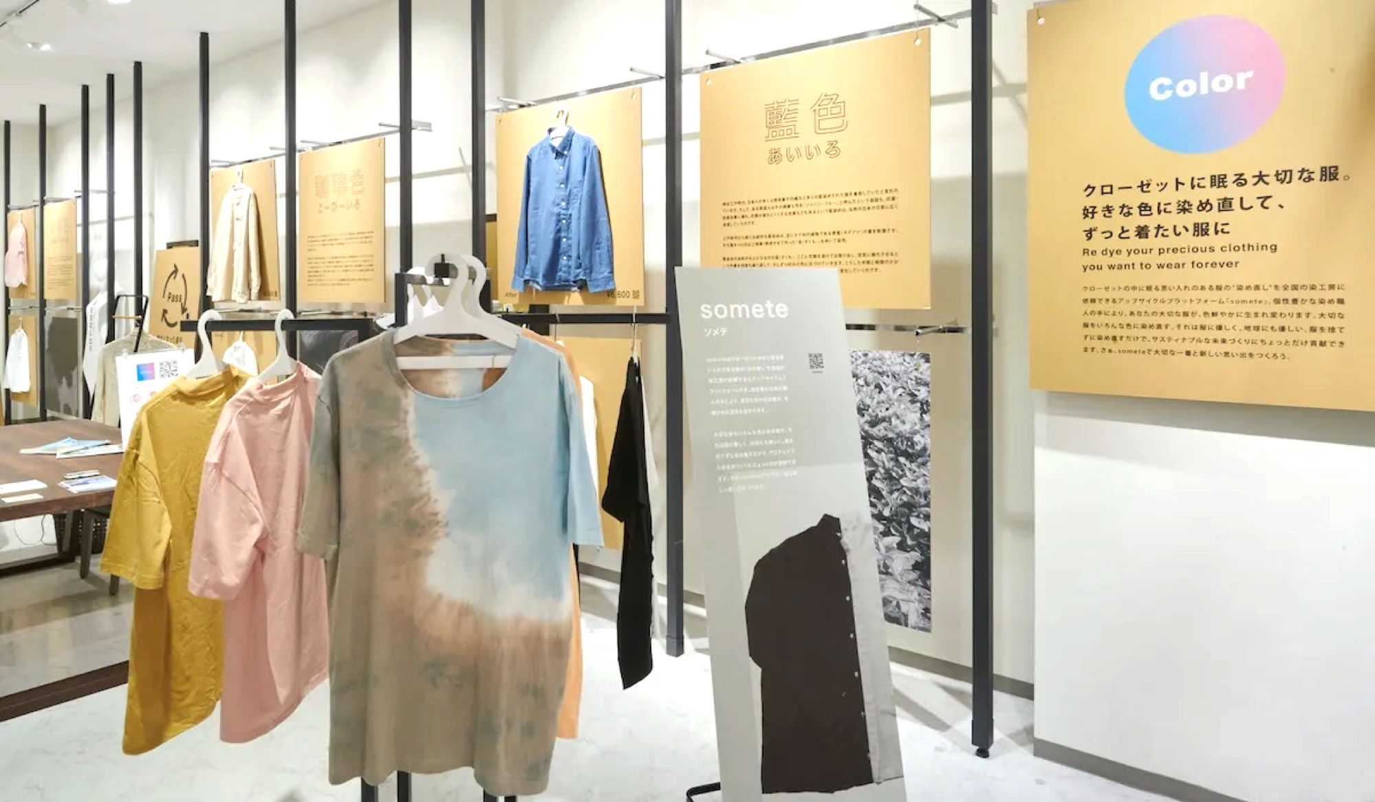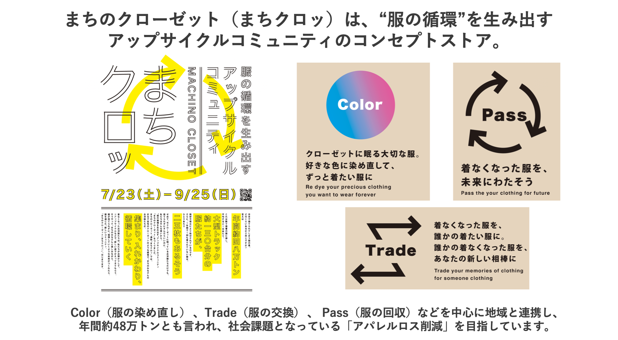 Color(服の染め直し) 、Trade(服の交換) 、 Pass(服の回収)などを中心に地域と連携し、年間約48万トンとも言われ、社会課題となっている「アパレルロス削減」を目指しています。
