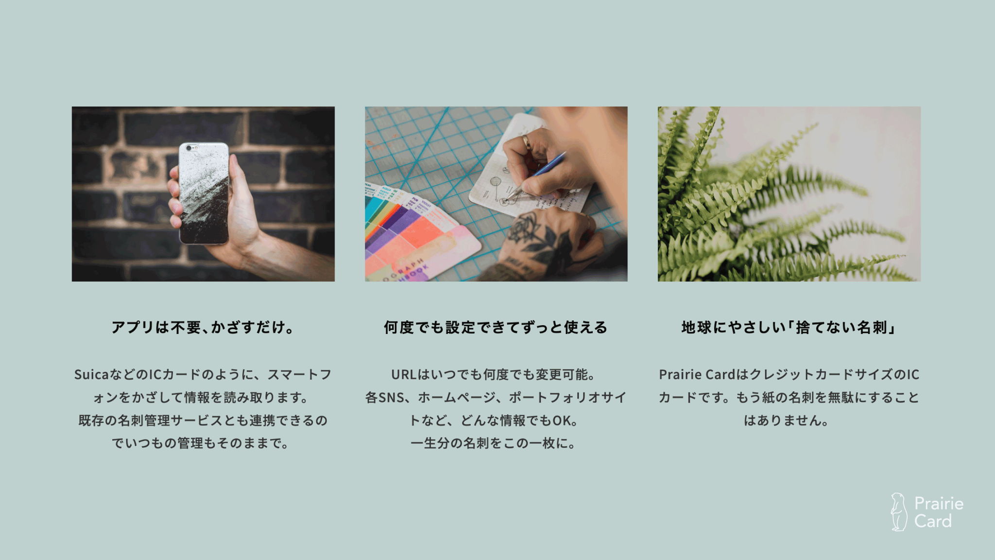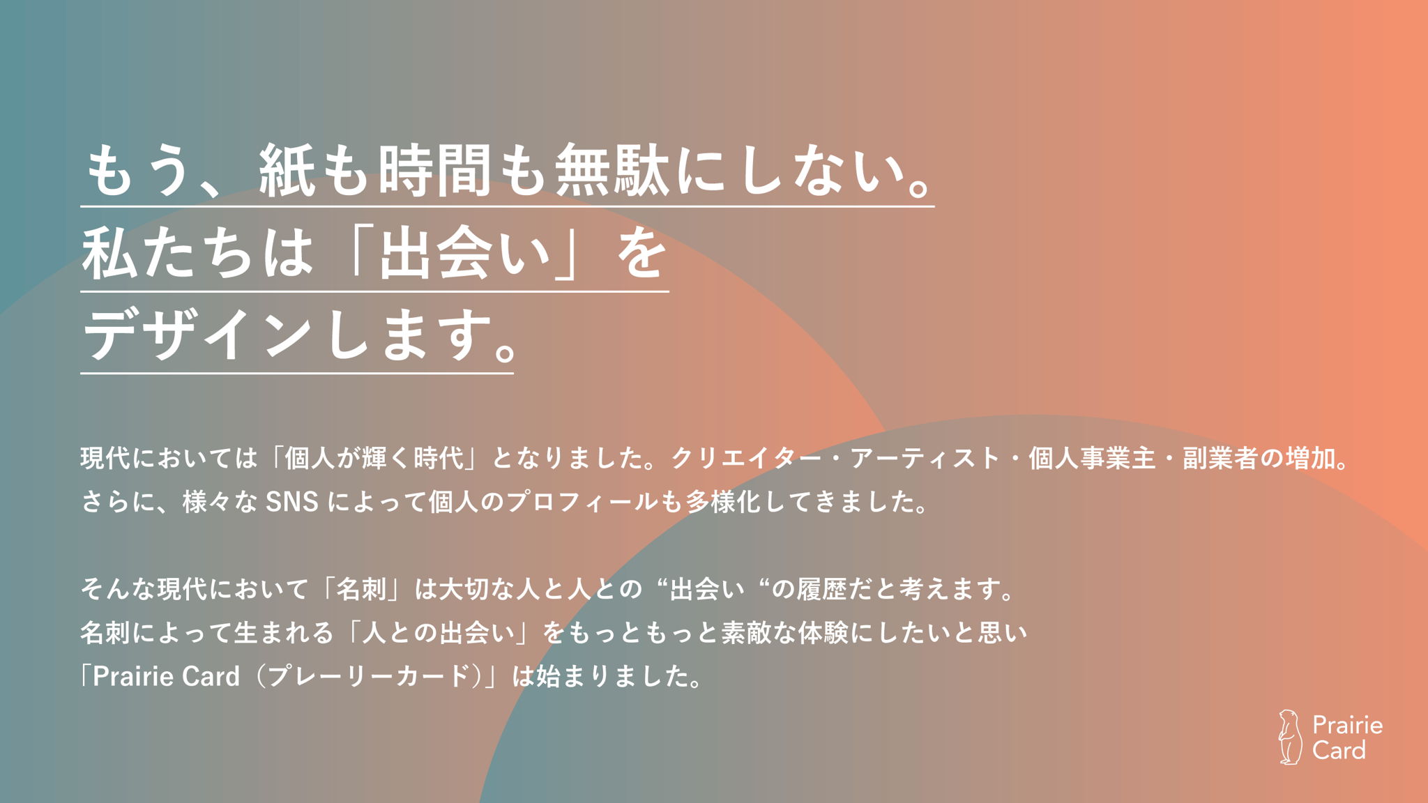 日本国内だけでも「名刺」の消費量は1日に約3,000万枚、年間の消費量としては約100億枚とも言われています。そこで私たちは「時間も紙という資源も無駄にしない名刺」プレーリーカードを始めました。スマートフォンをかざすだけで情報交換ができる「デジタル名刺」の製造と販売、さらに、名刺には掲載しきれない情報をまとめるためのウェブアプリケーションの開発と提供を行っています。組織の1人ではなく輝く1人の個人としての魅力を伝える新たな「出会い方」を世の中にデザインします。地球にとっても人類にとっても健康的である未来を目指します。