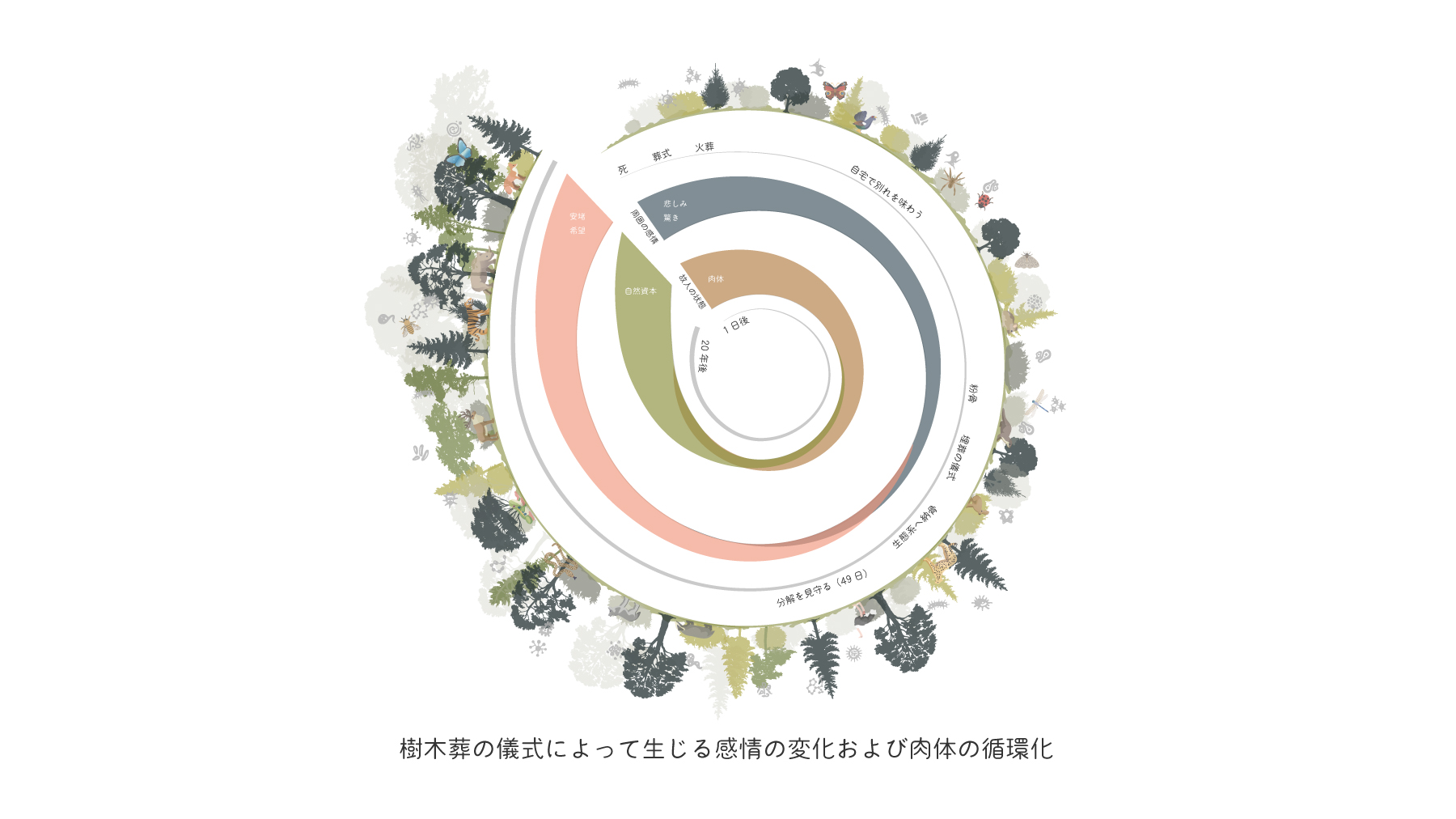 本作品は、故人の遺体を土に還し、微生物に分解してもらうことで大きな生態系の循環に組み込む、”死と循環”をテーマにした未来に起こりうる新しい埋葬の在り方を提案する。作品は、樹木葬の風景とその儀式、物質と感情の変化を表すダイアグラム、微生物生態系の可視化の4つで成り立つ。