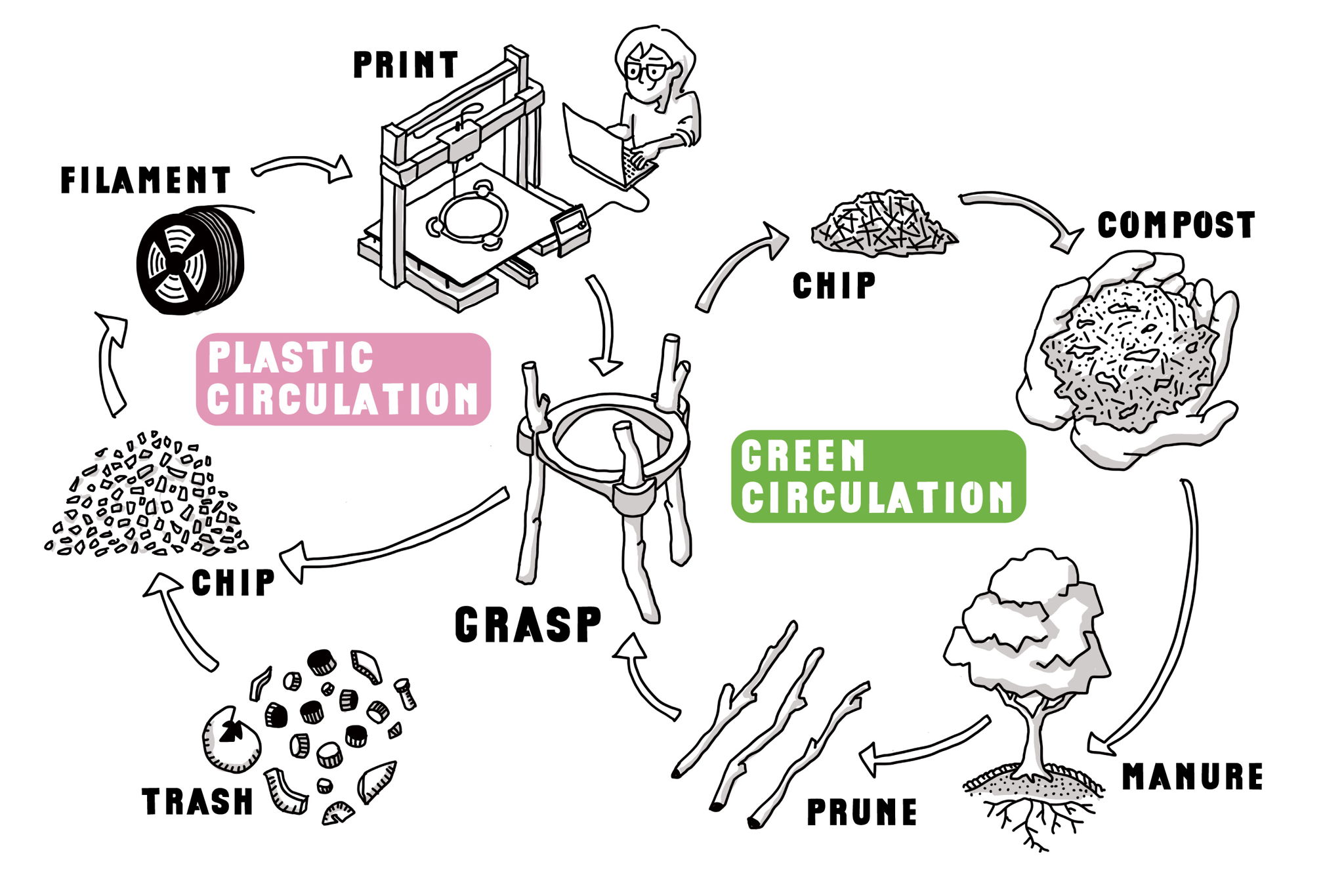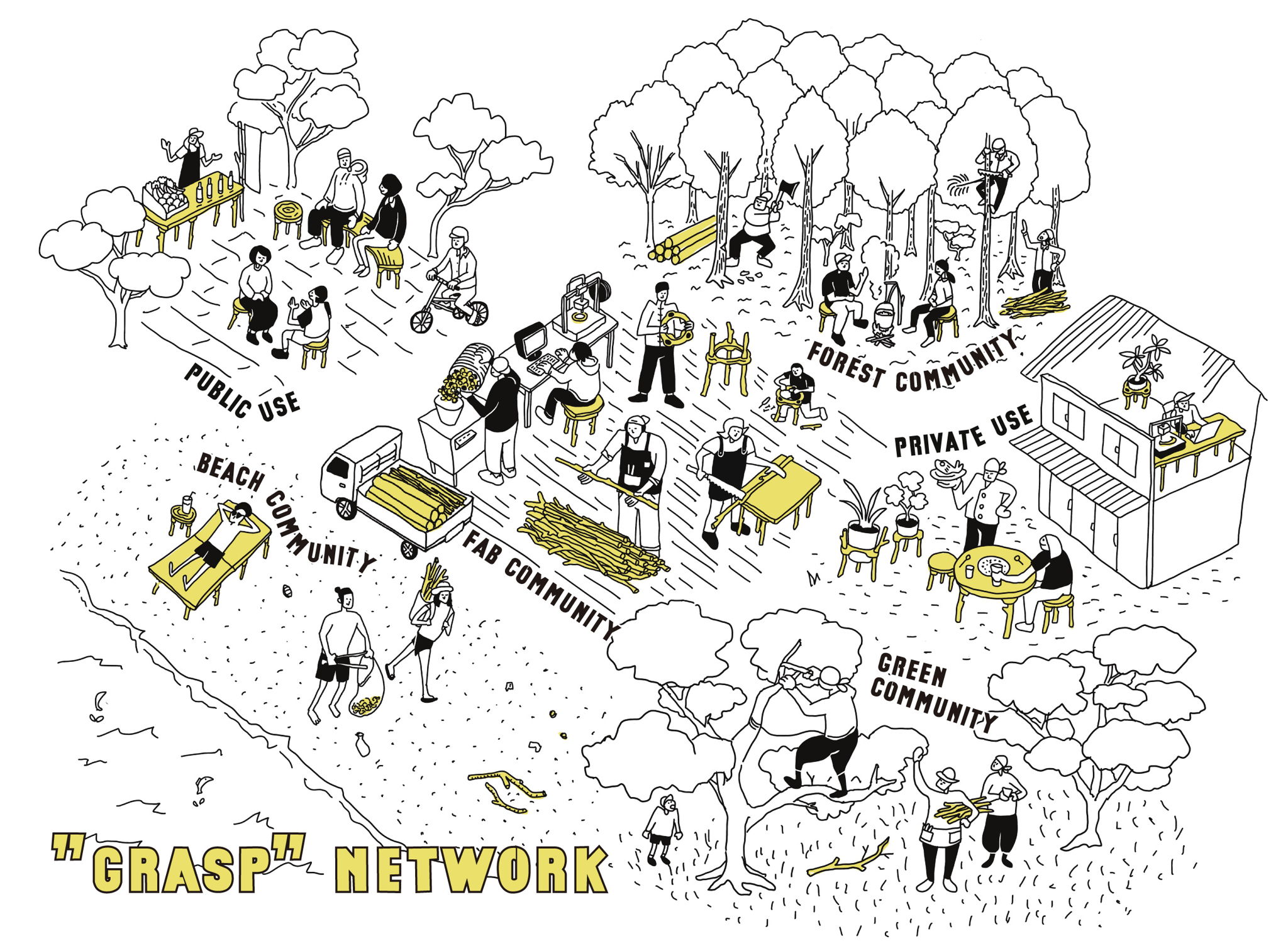 Our proposal, "GRASP," is a recyclable furniture that considers these issues of garbage in towns, mountains, and oceans as local resources, and utilizes pruned branches and thinned wood as legs and top boards, and marine plastic garbage as joints.