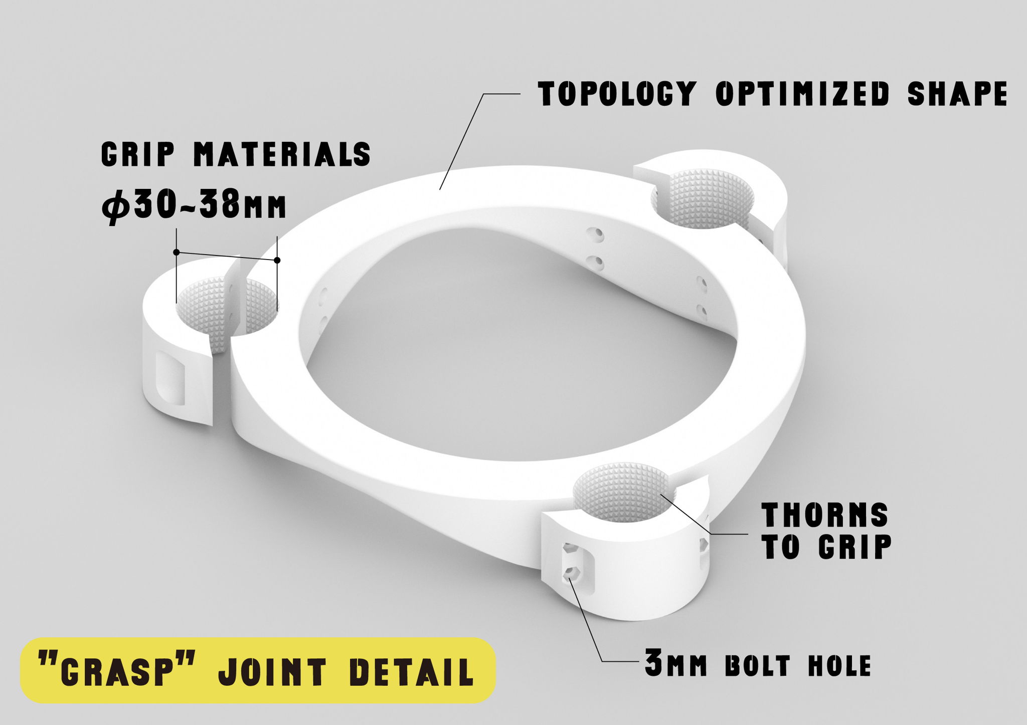 広く様々な地域でGRASPが展開されることを望んで、接合部は「掴む」だけで成立するような形状を採用し、誰もが簡易に組み立てられるようにしています。