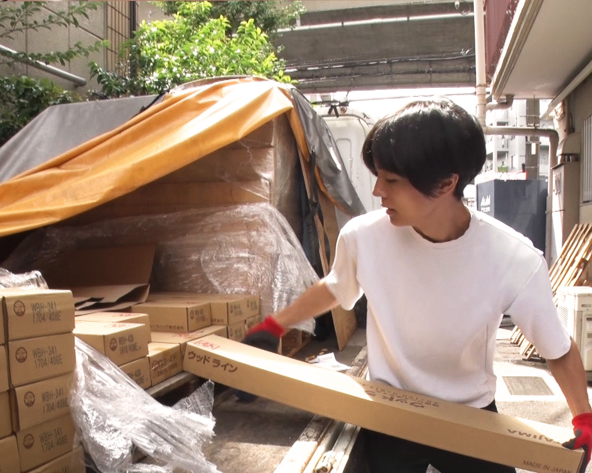 ① まずは建築現場の余剰品とメーカー廃盤品の買取り事業。この活動に賛同して下さる施主様の建築現場を回り、余った新品未使用の資材を買い取ります。この際に必ず検品を行い再度使用できるか否かを判断します。