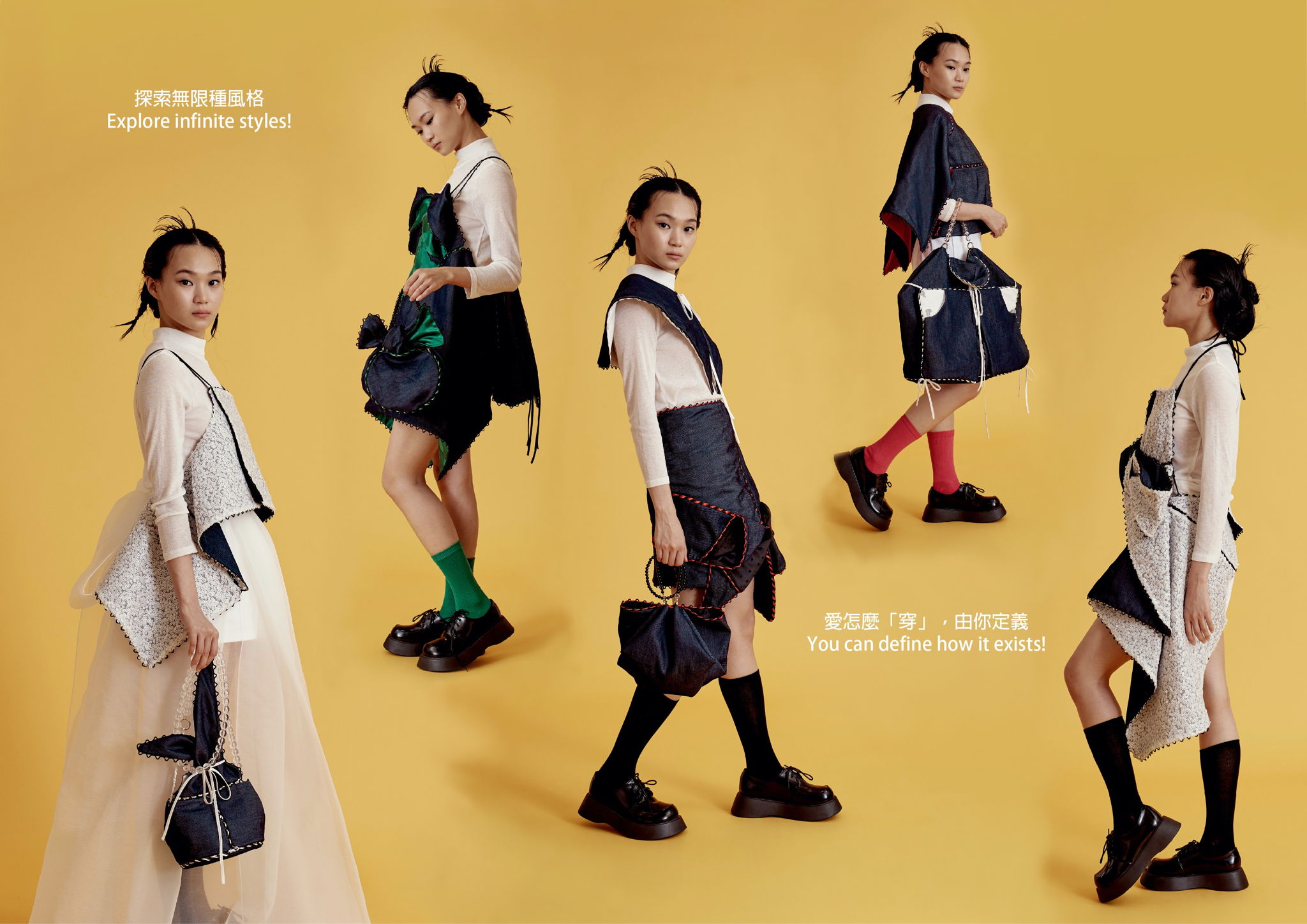 Through a simple threading action, the Tangram can be assembled into a variety of garment and accessories. Formal gowns can also be disassembled and re-threaded to transformed into bags or items for daily use. Garment will no longer be limited to only one style but will have infinite possibilities. Loved clothes last longer! Enjoy and use your creativity to define how it exists! -