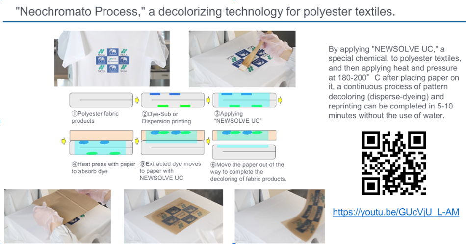 衣服の布地の色や柄の変更による再利用を可能にするポリエステル布脱色技術 『ネオクロマト加工』 The "Neochromato Process", a polyester textile decoloring technology that enables the reuse of garments by changing their colors and patterns.