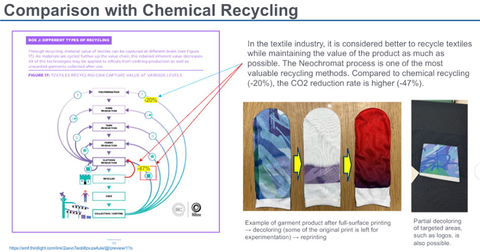 The Neochromato process is a new reuse technology that can change the color and pattern of polyester clothing as many times as needed. Creating new usages for recycling apparel and other sewn products is important before they are crushed or dissolved in chemicals. This reuse technology can extend product life and reduce environmental impact.