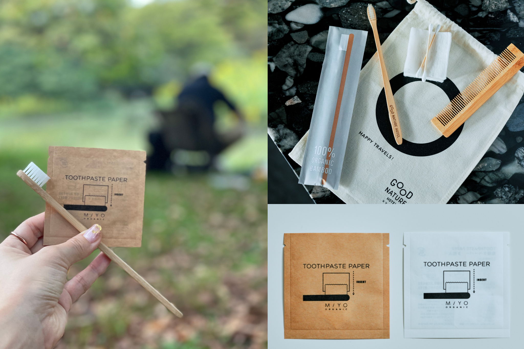 "Bamboo Toothbrush" and "Toothpaste Paper" are earth-friendly toothbrushing options. The toothpaste paper is made from a single amount of toothpaste used when brushing your teeth and foams up in response to saliva and water. It is convenient for amenities, disaster prevention, mountain climbing, and nursing care, and reduces plastic use by approximately 98% compared to conventional products.
