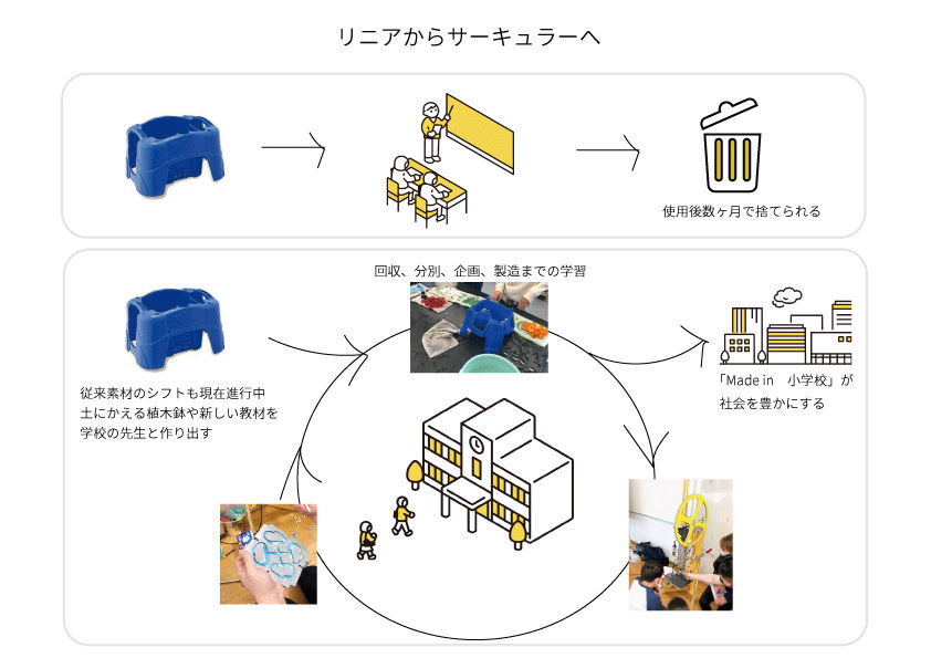 学校教材はプラスチックが多く、その殆どが使用後に家庭から廃棄されています。これまで何十年と変わらない市場で子供の数に合わせて製造されて年間3000トン以上の廃棄を繰り返しています。日本はプラスチック大国と呼ばれ、今後世界的にもプラスチック課題がより大きくなるうえで、この問題を置き去りにした教育に課題を感じ取り組みを始めました。地域や社会のステークホルダーとともに子供達と課題を共有し、学校拠点で自分たちが使用したプラスチック教材から「Made in 小学校」を社会に生み出すプロジェクトです。回収、分別、破砕、製品化まで学び、製品化したものを社会に出す事で、社会が生み出しているプラスチックに対し子供達が取り組むことで発生抑制や水平リサイクルに対する関心を寄せることも重要であると考えています。本プロジェクトでは全国の学校に販売網を持つ各地域の教材販売店の協力により、大きな効果を生み出すと考えております。まだスタートしたばかりですが、大学、企業、自治体からの協力をいただきながら進めています。