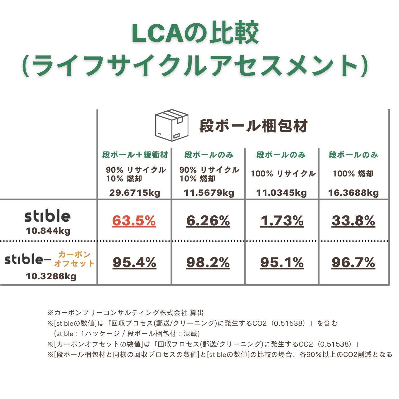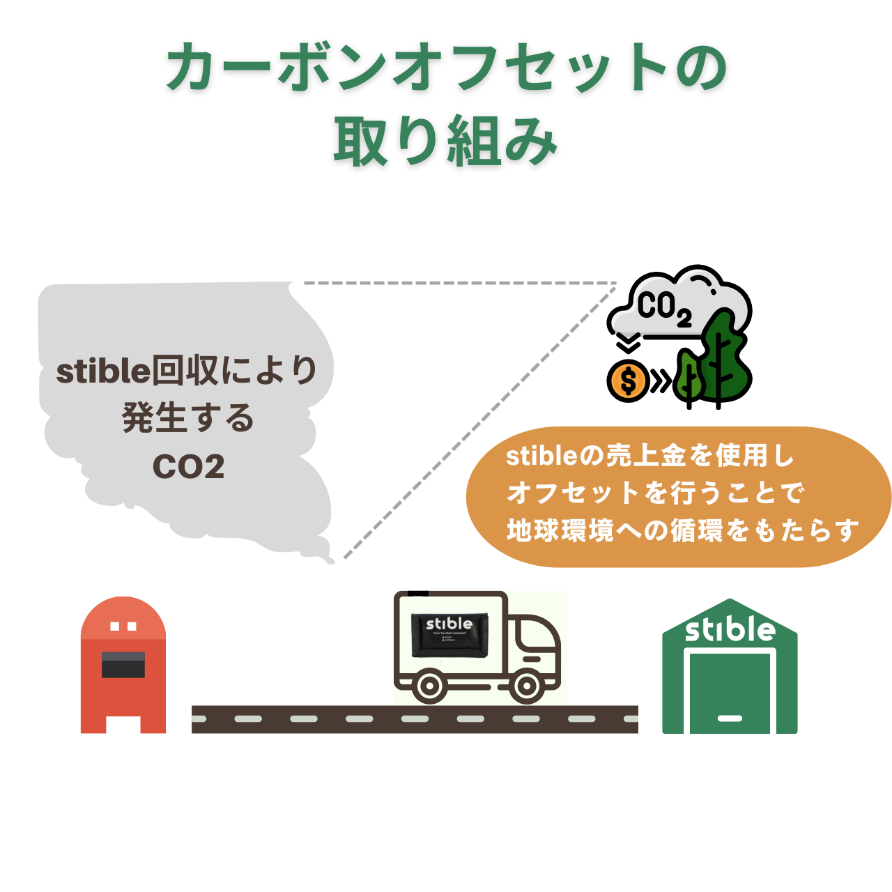 一年に一度、stibleの回収フェーズで排出したCO2の算出を行い、オフセットを実施致します。