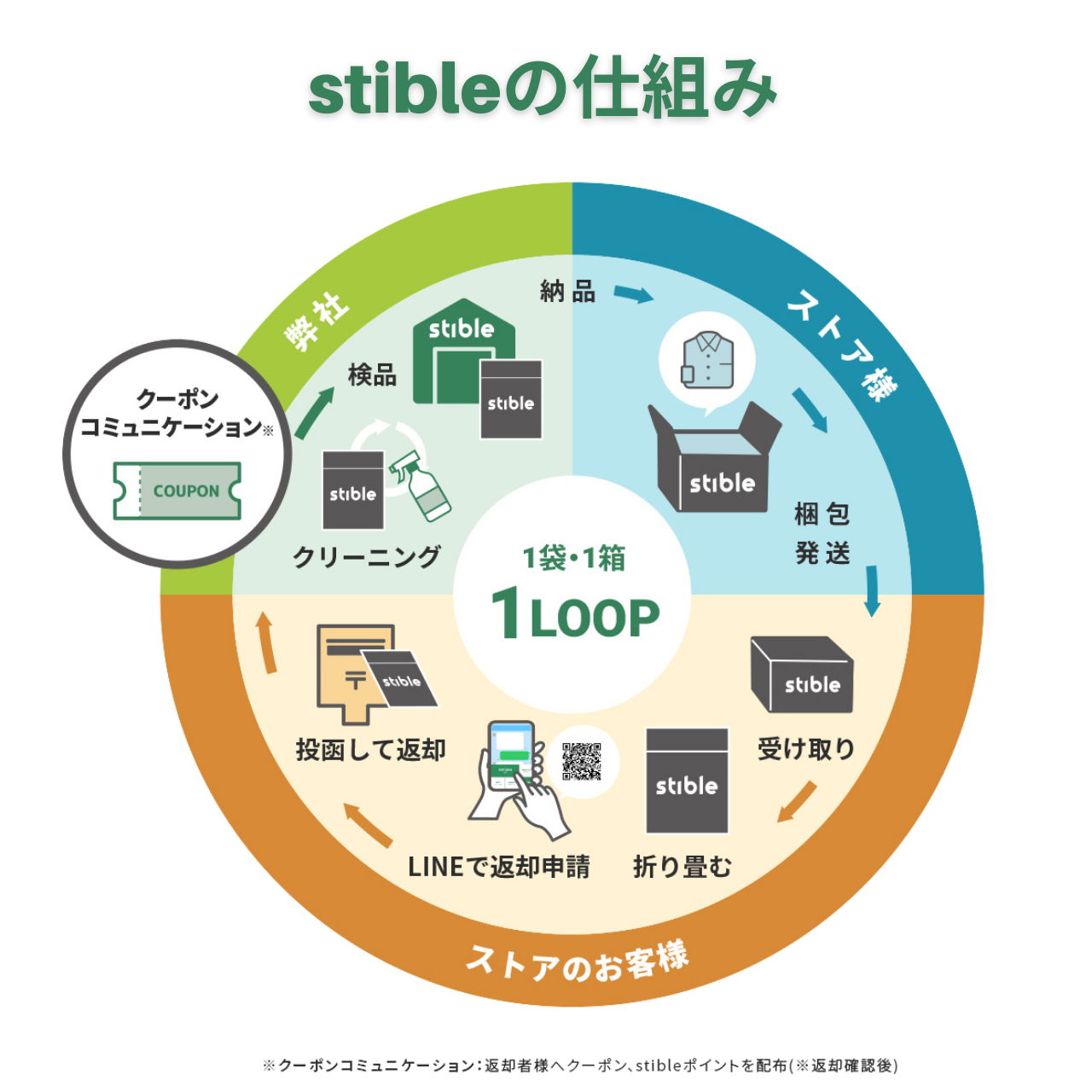 従来のダンボールを使用した場合「リサイクル/破棄」で止まってしまうため、お客様とのコミュニケーションは発生しずらいかと思います。しかしstibleサービスが展開されることで[ストア様・お客様・stible]にて「クーポンコミュニケーション/ポイントコミュニケーション」が発生します。すなわちコミュニティーが自然と生まれていくと考えております。