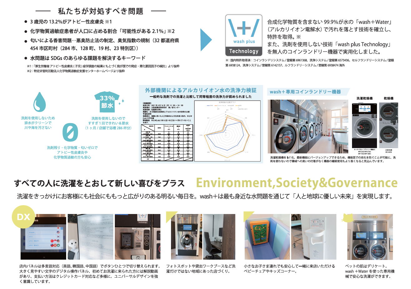 独自技術である「wash+ Technology」によって、洗濯においての1~3の問題を解決することができる。人が生きていくために欠かせない水についての問題は、SDGsのあらゆる課題を解決するキーワードととらえ、企業活動を通じた水資源の問題解決とともに、協業企業含め多くの事業者の活性化を実現し広く事業展開し続けている。 -