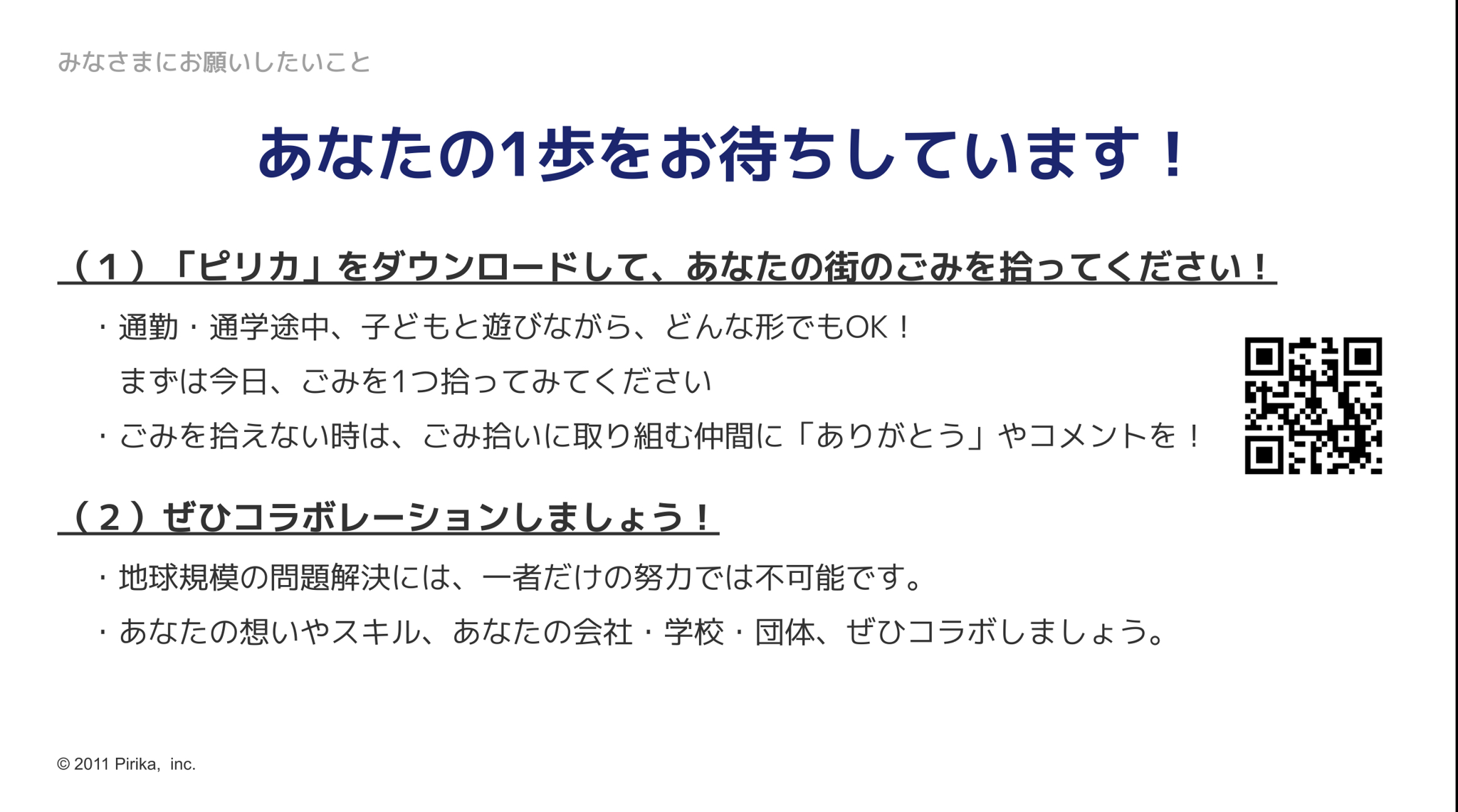ごみ拾いアプリ「ピリカ」により、世界中の一般市民がごみ拾いを通じ、このままだと2050年までに魚の重量を上回るとされる海洋ごみの削減、海洋生態系の保護に貢献できる仕組みを構築。これまでに100カ国以上で、累計2億個以上のごみを回収。