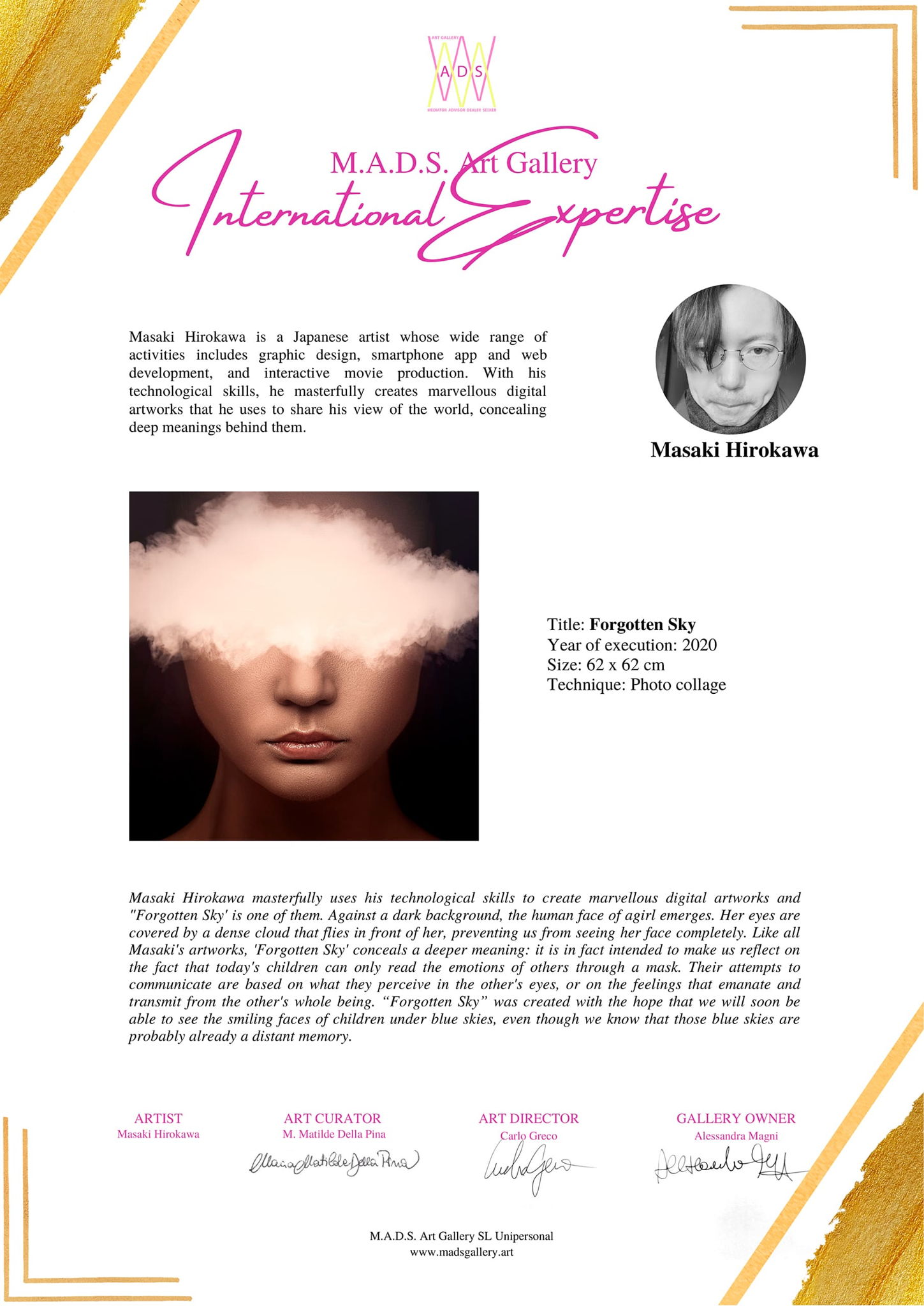 Masaki Hirokawa masterfully uses his technological skills to create marvellous digital artworks and "Forgotten Sky' is one of them. Against a dark background, the human face of agirl emerges. Her eyes are covered by a dense cloud that flies in front of her, preventing us from seeing her face completely. Like all Masaki's artworks, 'Forgotten Sky' conceals a deeper meaning: it is in fact intended to make us reflect on the fact that today's children can only read the emotions of others through a mask. Their attempts to communicate are based on what they perceive in the other's eyes, or on the feelings that emanate and transmit from the other's whole being. “Forgotten Sky” was created with the hope that we will soon be able to see the smiling faces of children under blue skies, even though we know that those blue skies are probably already a distant memory.