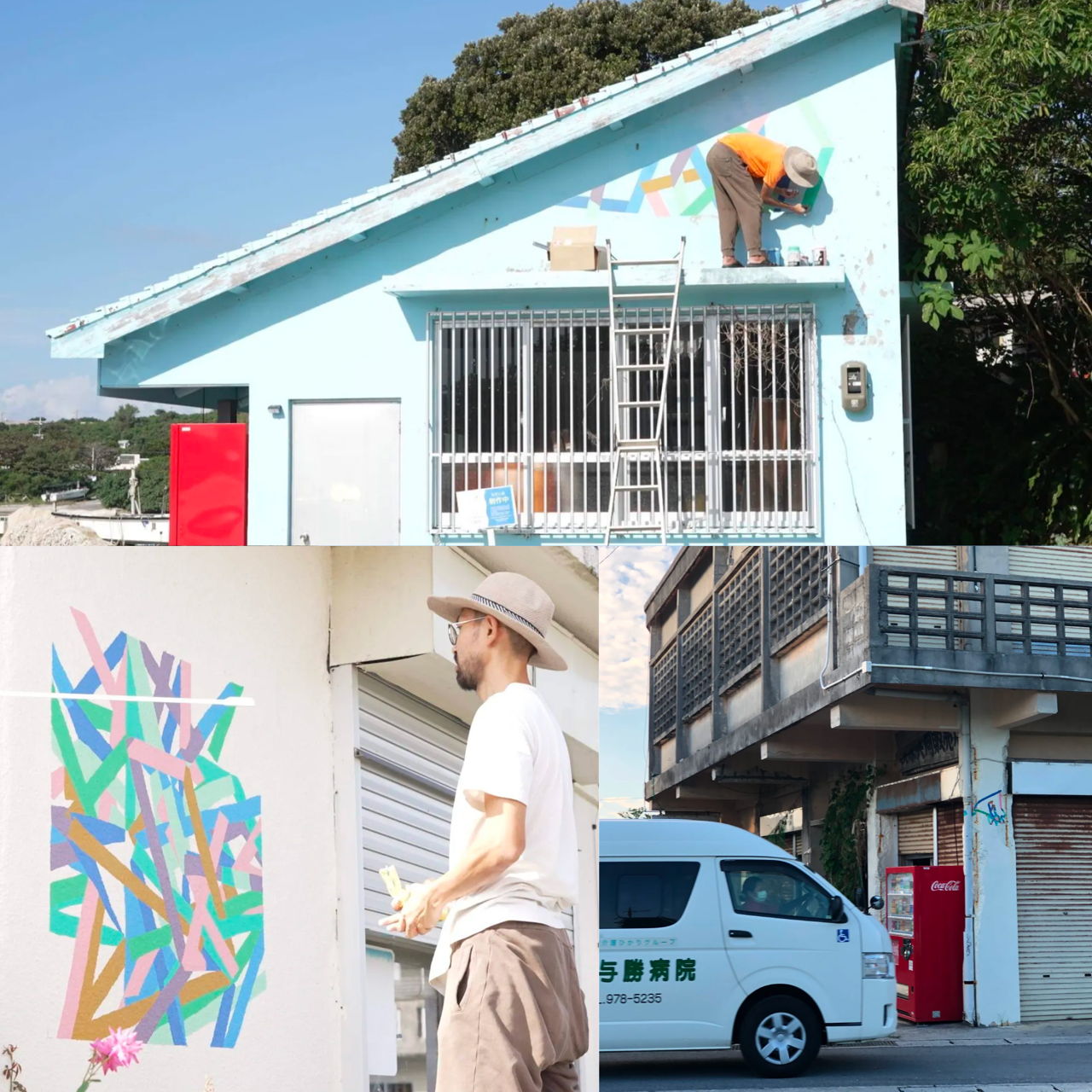伊計島漁港は想像と違い、やわらかでおだやかな風がふく場所でした。釣人や海人が定期的に訪れ、それぞれのペースで楽しんでいます。この場所の開放的な空気感を水色でペイントされた建物、三角の屋根に調和するようデザイン。共同売店方向からみても、シンボリックな作品になるよう大きめでわかりやすいラインにしています。屋根の影は、作品と重なるように角度をあわせているので、晴れた日に影とあわせて見てほしいです。