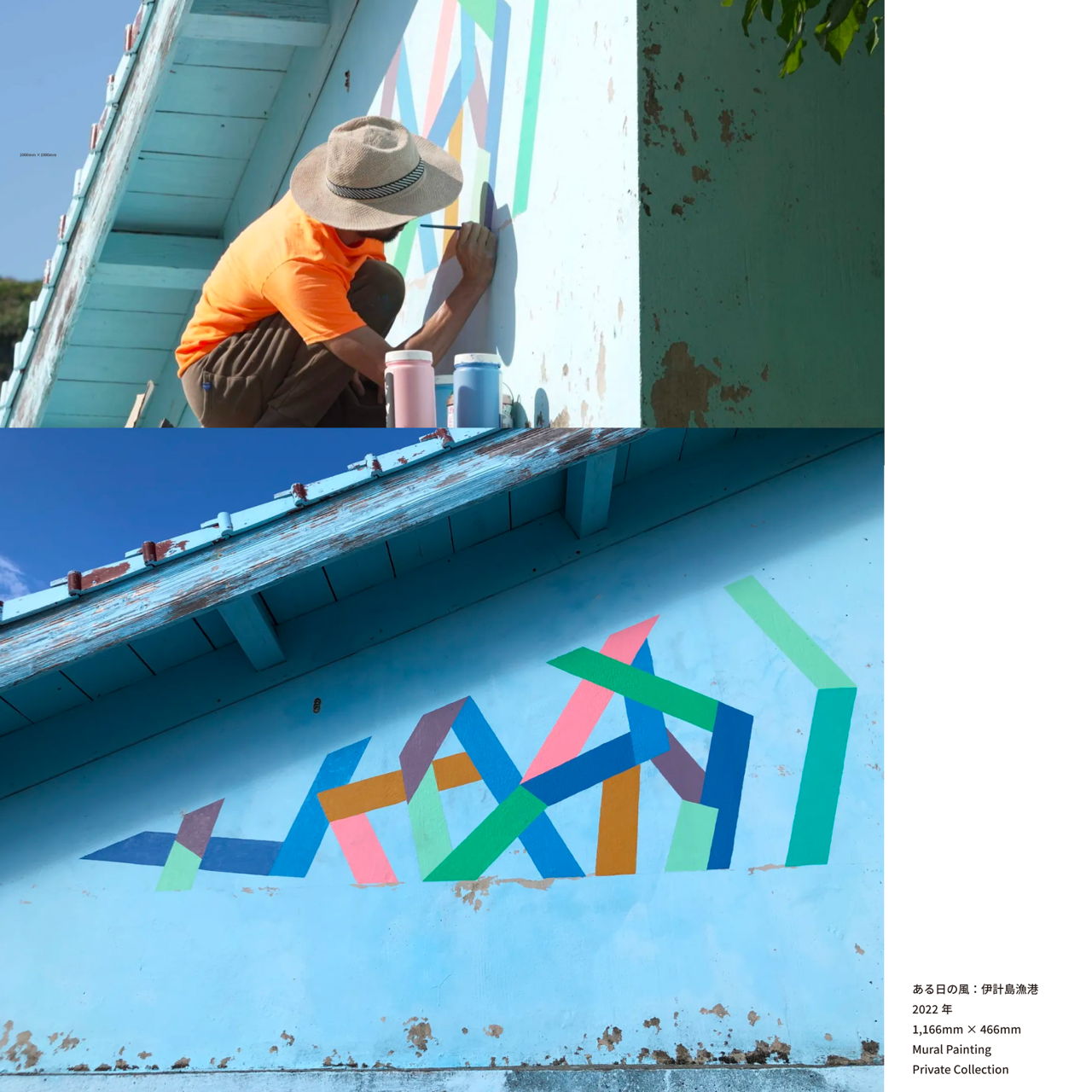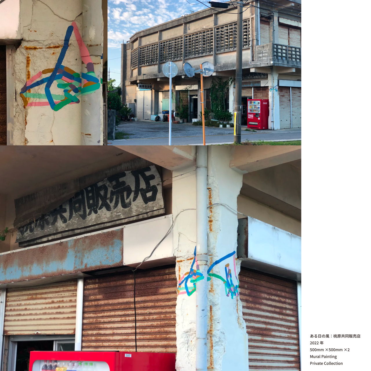 加速度センサーを使用して、風を3次元で観測。その動きをグラフィックにして、2次元で壁画して投影しました。沖縄県のディープな辺境、桃原共同販売店、新里商店、伊計島漁港の3箇所に描かれています。