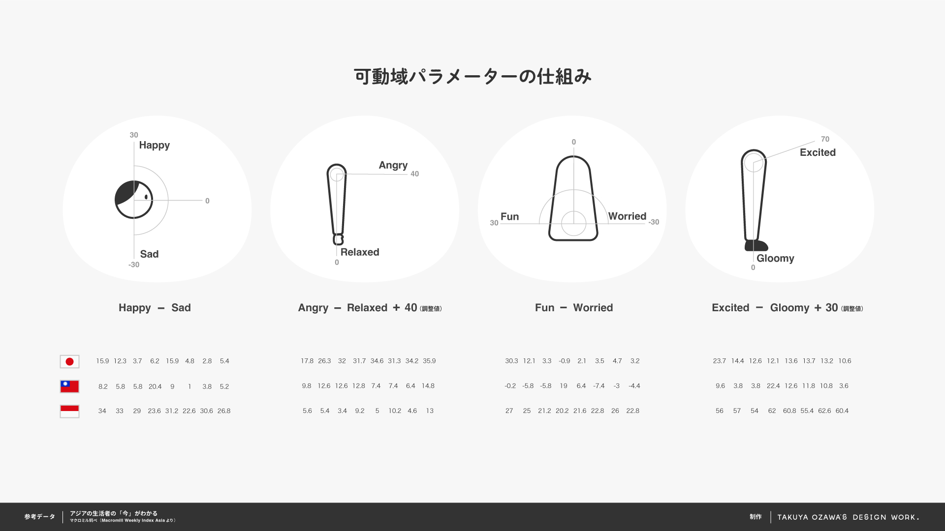8つの感情のデータから算出した2ヶ月分の数値を、人型ピクトグラムの関節(頭/腕/胴体/脚)の可動域に割り当て、アニメーション化しています。