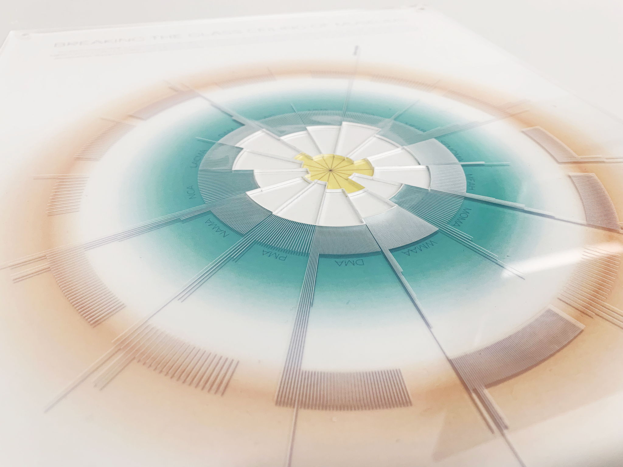 この「Glass Ceiling」は、アート業界にもあるのではないでしょうか?このデータビジュアライゼーションは、アメリカで人気のある14の美術館それぞれが作品を所有している女性作家の数を示しています。中央のナイチンゲールチャートは各美術館の男女の作家数の比率、そしてその周りにある線の数が女性作家の数、線の長さはその線の女性作家の人種、出身地を示しています。