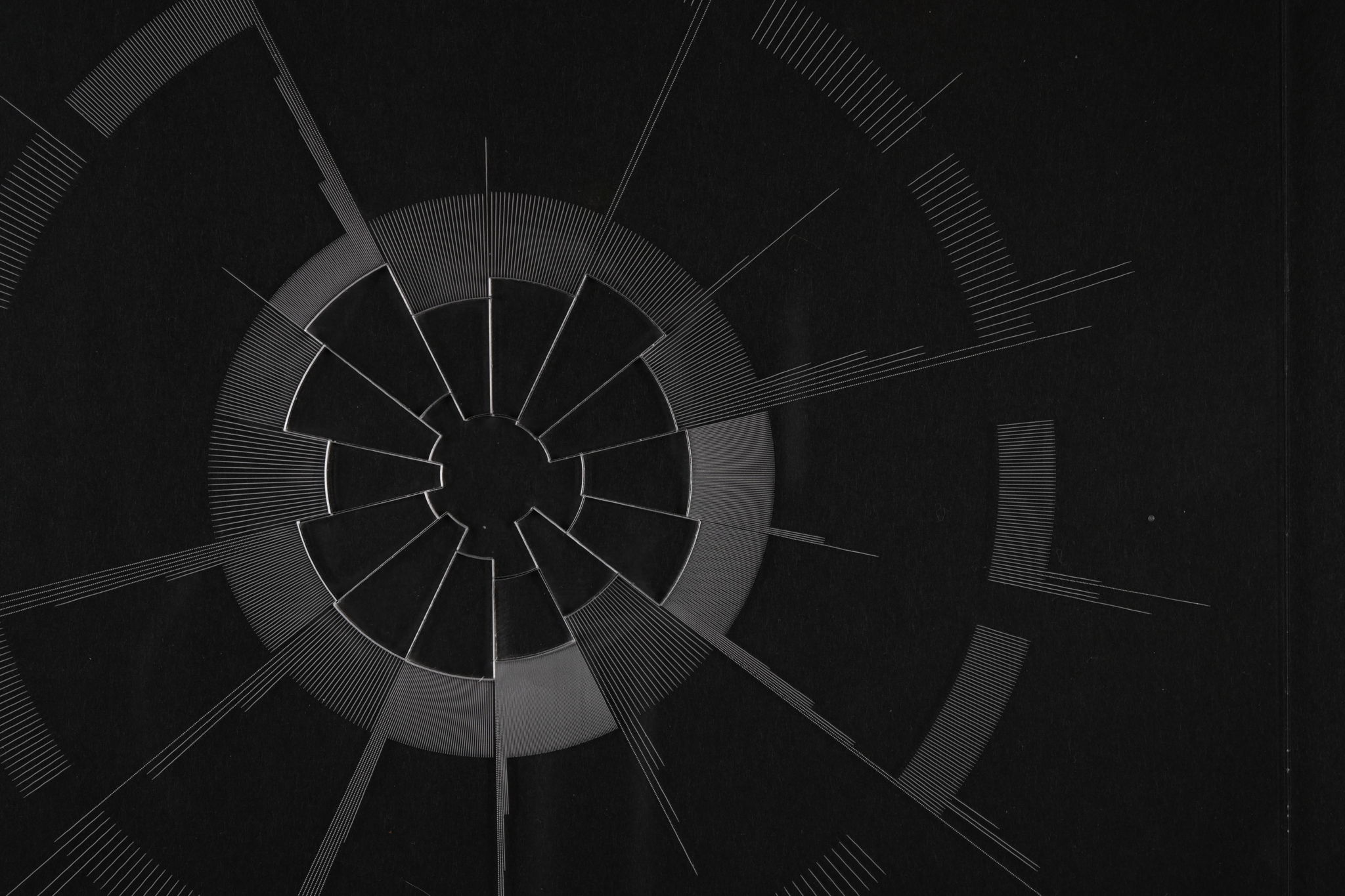 透明のアクリル板にグラフをレーザー加工することでガラスが割れることを表現しました。また、半透明の紙に光をイメージした色合いで詳細を記載し、その紙をアクリル板に重ねることでガラスが割れた向こう側の光をイメージしています。