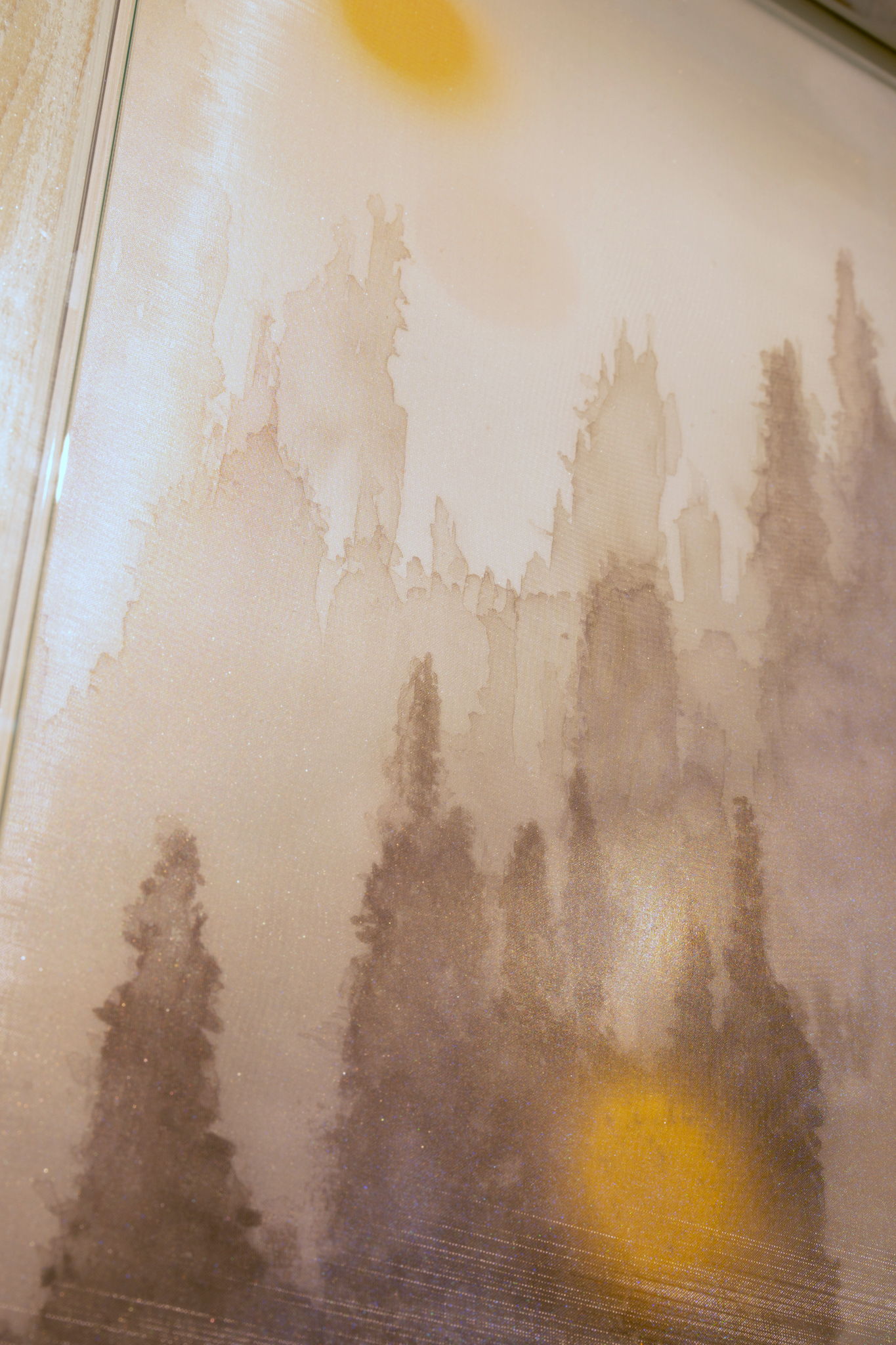 本作「神域山水_那智の滝_2021_1024」は日本人の自然観、宗教観を表す代表的な詩とされる西行法師の歌「なにごとの おはしますかはしらねども かたじけなさに なみだこぼるる」に着想を得て制作を行った作品です。この歌は西行法師が伊勢神宮を詣でた際になにもないがそこに佇む「気配」や「存在」いわば神様の存在に触れ、溢れ出る感情に涙を流したことを歌ったものです。この「気配」や「存在」は目には見えないが確かに存在するものとして古くから扱われ、多くの熟語やことわざにも使われる言葉です。これは芸術作品に対しても扱われ、その作品に「気」が宿る、漂う、感じるなど作品の批評の言葉として用いられてきました。その中でも中国南北朝時代の画家、謝赫が説いた画の六法における「気韻生動」は東洋絵画における絵画論の礎になった言葉です。この画の六法に書かれていることには気韻生動は、作者みずから体験した妙理を画面に定着し表現したものを通じて、鑑賞者はそれを再び体験することができたかといったことと定義しています。このように東洋絵画ではいかにして作品に気を込めるかが重要な要素です。しかし、かつての信仰心を持った人々の様な身体感覚を体現することは信仰心の薄れた現代に生きる我々には難しいでしょう。そこで現代の我々がある種の身体感覚を補強できる客観的なものとしてデータを用い、データから抜け落ちてしまった主観性を筆で描くことでかつての人々の感覚に近づけるのではないかと考えました。手法としては神社の気象データ(温度、湿度、気圧、等々)を入域-参拝-出域までの詣でる一連の行為と共に計測し、それをエクセルでグラフに変換した図をデータ毎に山水図を描く要領で描きました。この手法により山水に見立て表現した作品が「神域山水」です。これはその日、その時、その天候でしか形成することのできない神域の空気を綴じ込めた図像であり、不可視な存在の表象かもしれません。