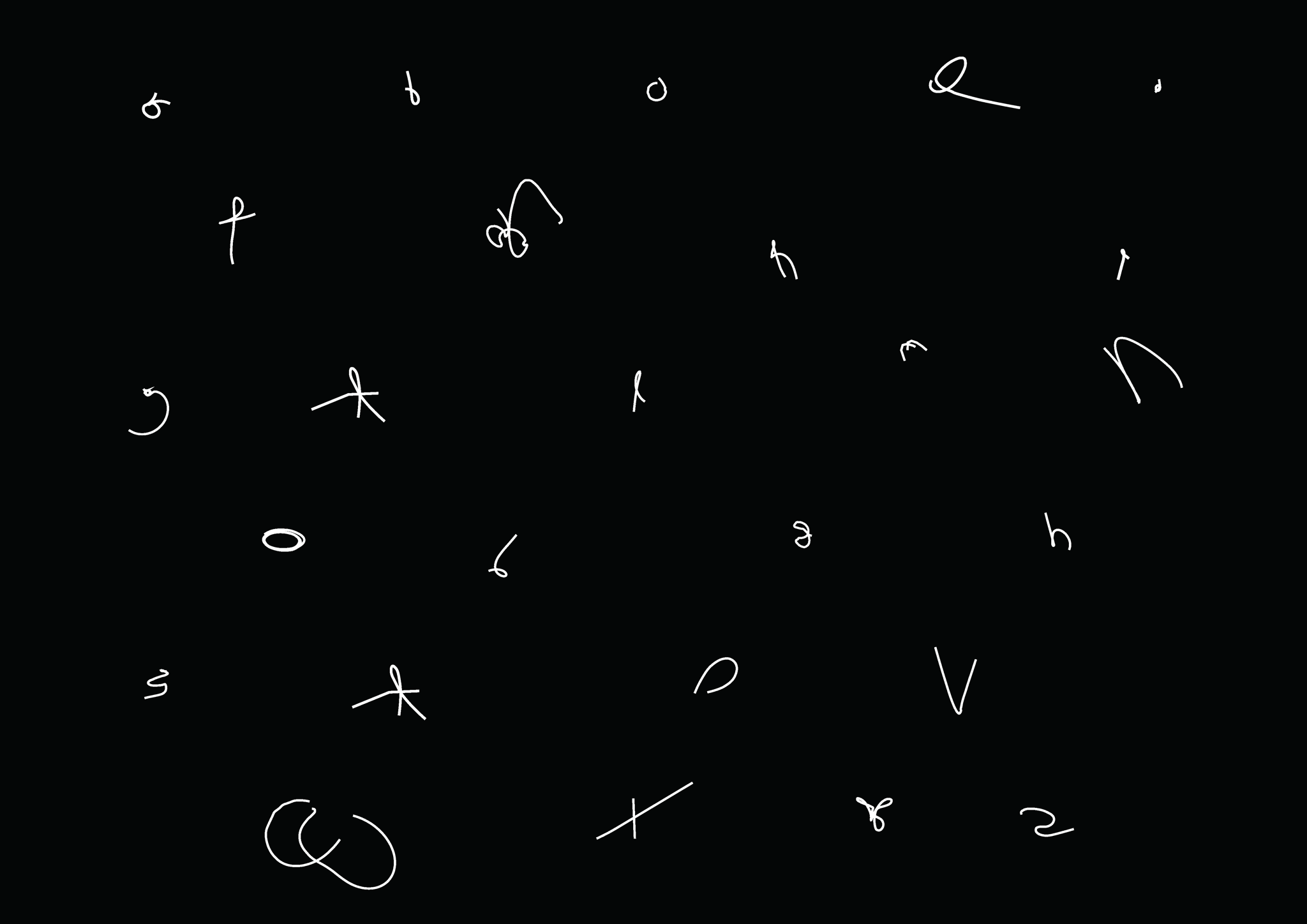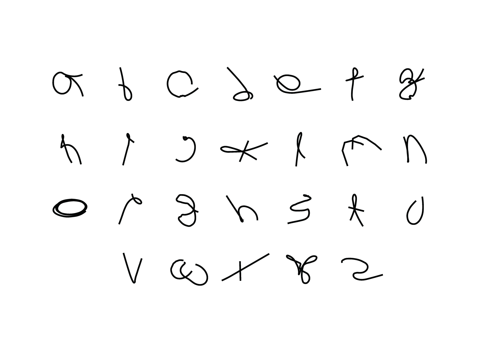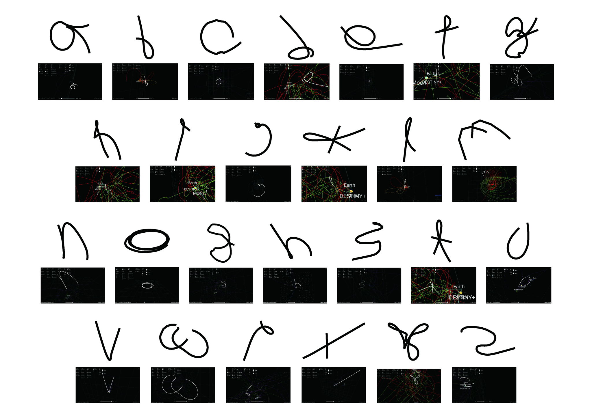 このアプリケーションを触っていると、特定の視点・角度で交差し合った軌道の線がアルファベットに見えるときがある。アルファベットが見えたタイミングで、すかさずスクリーンショットを撮り、線を抽出する。こうして26文字の軌道アルファベット表が完成した。