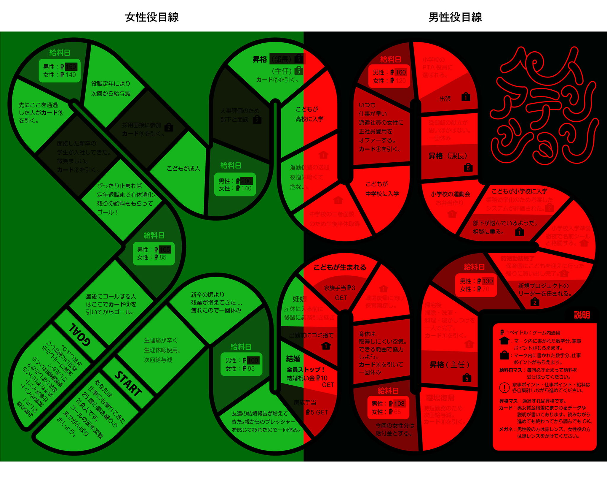 内閣府や総務省、厚生労働省、その他関連機関が公開している統計データを参照すると、現代の日本における男女の賃金格差は近年縮小傾向にはあるものの自明なものであり、ジェンダーギャップ解消に向け取り組むべき大きな課題のひとつであることがわかります。しかし、個人的な感覚としては、データ上明確に存在する格差も、生活の中では実感として把握が難しい場合が多いように感じています。そしてそう感じる背景にはおそらく、この社会では男女の性別二元論に基づいた性役割をそれぞれ要求される機会が少なくないこと、そして個人がその枠組みを越えることの困難さが少なからず関係しているのではないかと考えました。リサーチを進める中で、ただデータをわかりやすく整理し概観するだけでは見過ごされてしまう個人の、しかしある程度性別や立場によって共通した経験や状況があり、それらについて相互に共有と議論を深めていくことの重要さを感じました。そこから、自分とは異なる他者の生活やそれぞれに課される課題について疑似体験を通じ学びを深める、という形態が取れるすごろくをメインの媒体として採用しました。