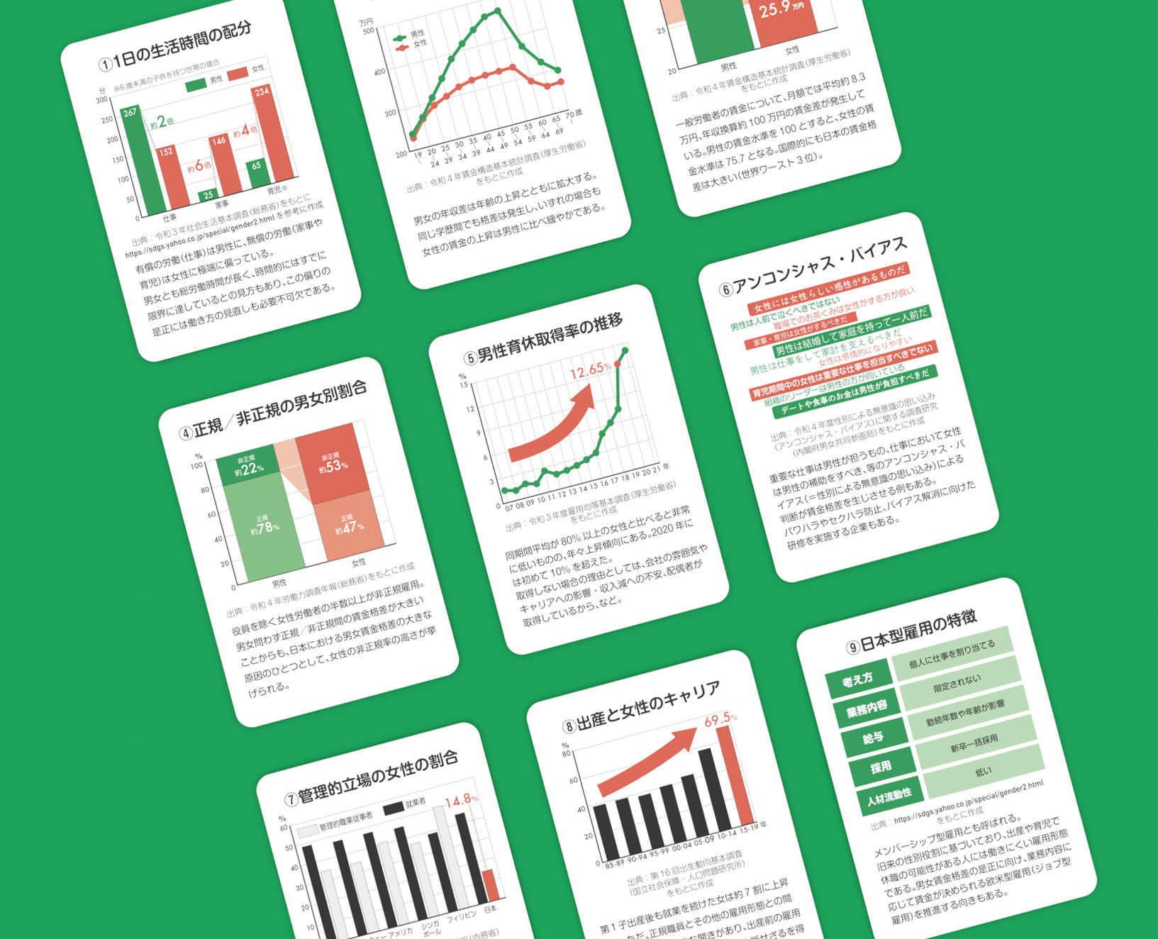 プレイヤーはゲームの中で複数回賃金を受け取りますが、女性役・男性役で異なる金額が設定されています。順当に回れば、ゴール地点でそれぞれの手元に残った総報酬の差額は、現在の日本における男女賃金格差と同等の割合(=男性一般労働者の給与水準を100とすると女性一般労働者の給与水準は75.7)になります。その結果と、ゴールまでの道のりで取得した、男女賃金格差の背景や原因についての情報をまとめたカードを手がかりに、ゲームの進行中や終了後の議論を促す、という使用方法をイメージして制作しました。