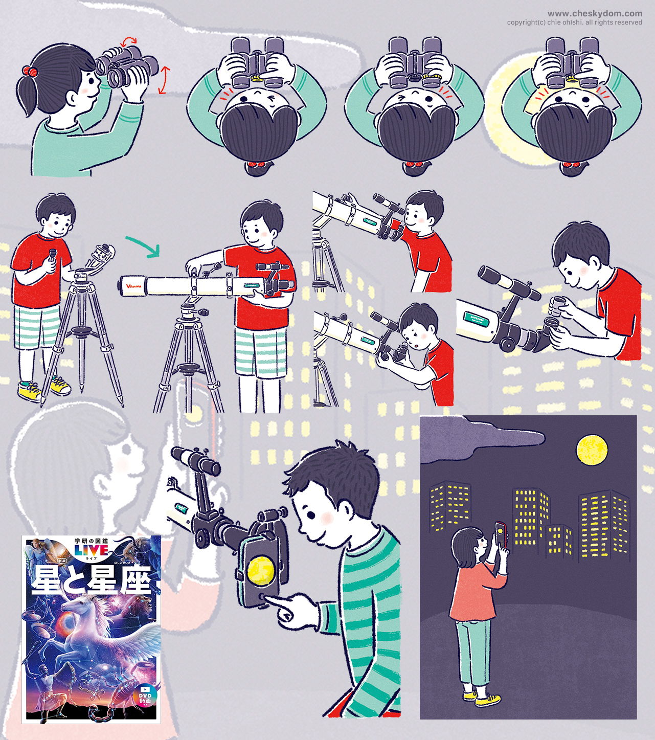 学研の図鑑LIVE『星と星座 新版』の双眼鏡・望遠鏡の使い方・写真撮影の仕方についてのページのイラスト