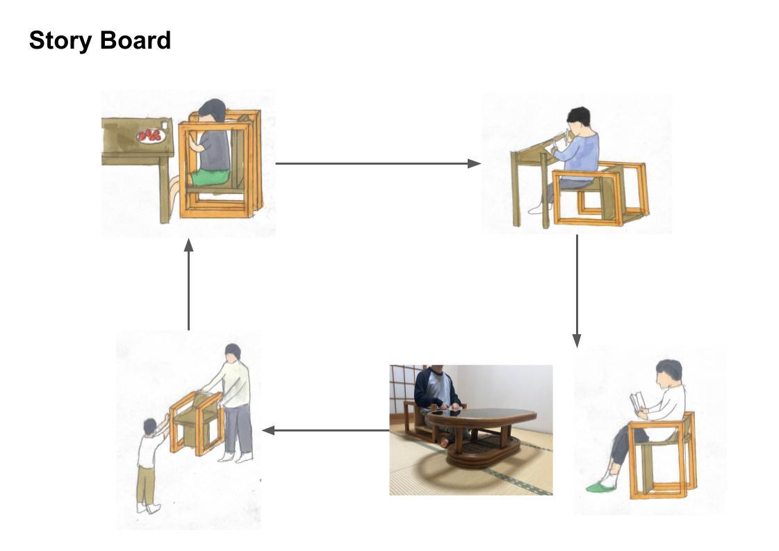 By rotating the chair, the height of the chair changes in four steps. By doing so, one chair can be used by children and adults all the time, and can be passed on to the next generation.