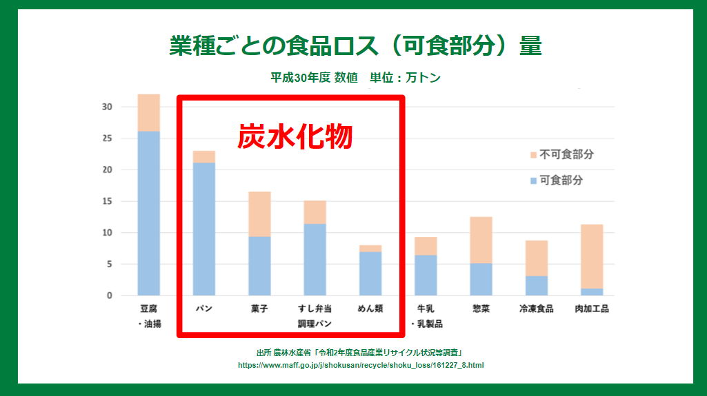 農林水産省が出している、「令和2年度食品産業リサイクル状況等調査」の業種ごとの食品ロス(可食部分)量では、食品単体で見ると豆腐・油揚の廃棄が多いが、カテゴリで括るとパン、菓子、すし弁当・調理パン、めん類といった「澱粉や糖を含む炭水化物」が圧倒的に多い。企業から排出される食品ロスは、ブランディングの都合上、値段引いて販売ができないことが多く、やむを得ずコストをかけて廃棄を行っている。