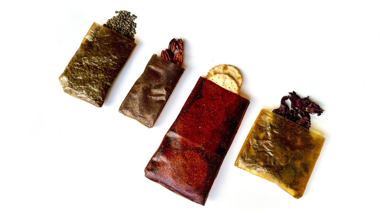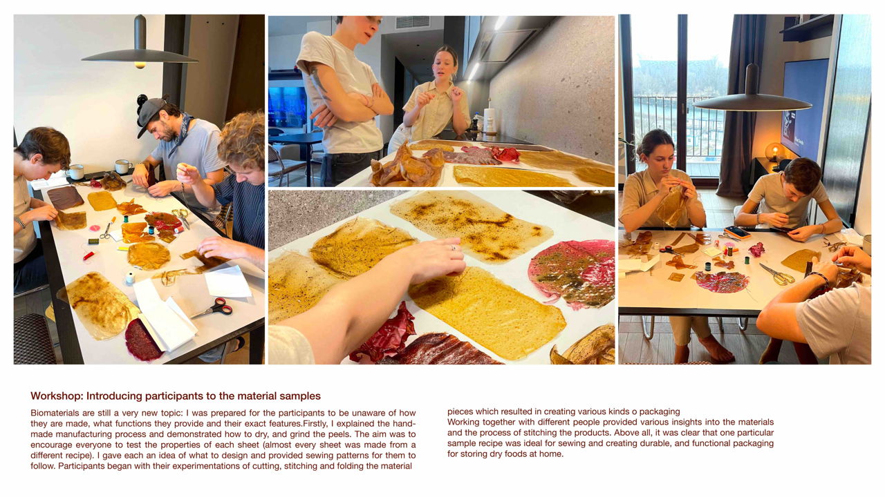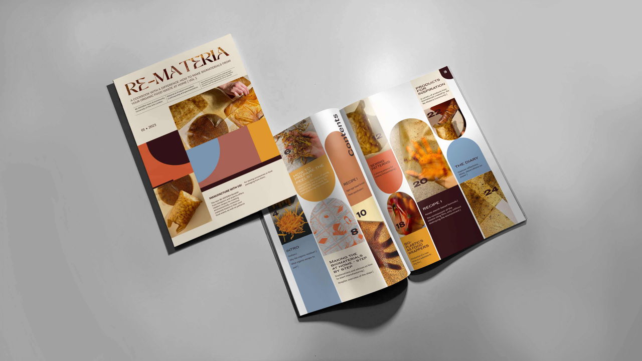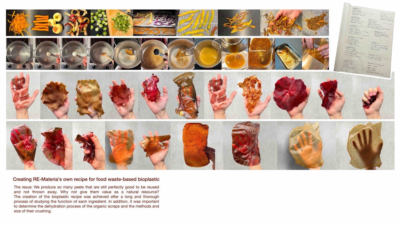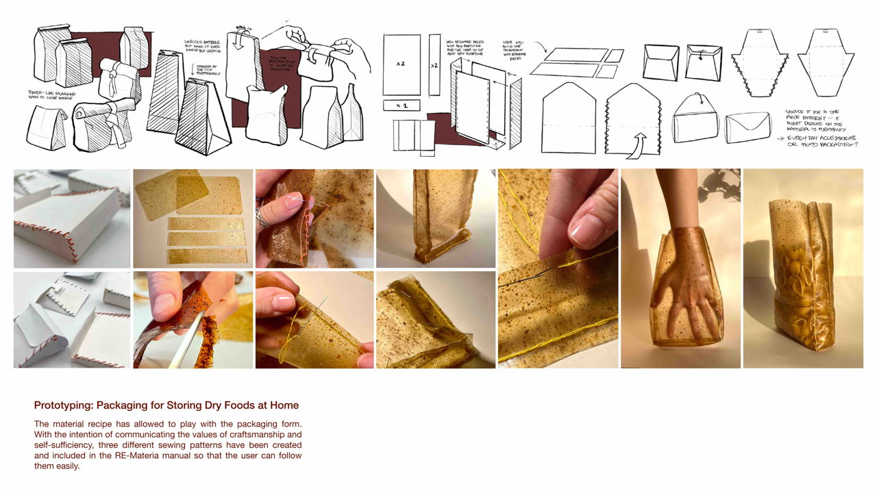 RE-Materia DIY Kit empowers individuals to create biodegradable bioplastic packaging from household fruit and vegetable peel waste while encouraging a shift in mindset towards sustainability and circularity. The kit provides bottles with essential ingredients and a manual. The latter guides the user through the world of biomaterials, proposes two recipes for DIY bioplastics, and provides sewing patterns for stitching packaging from the self-made materials.
