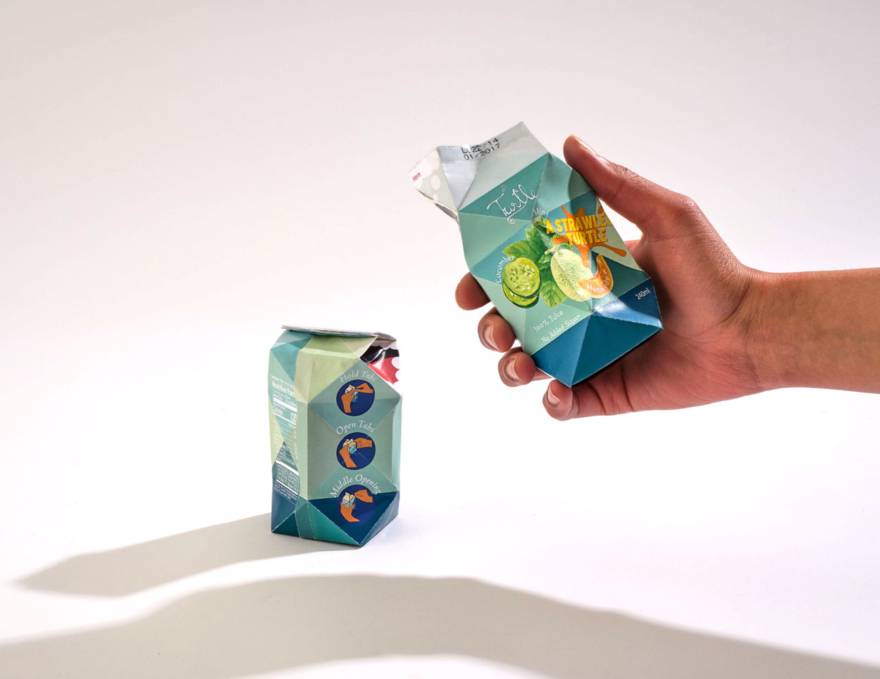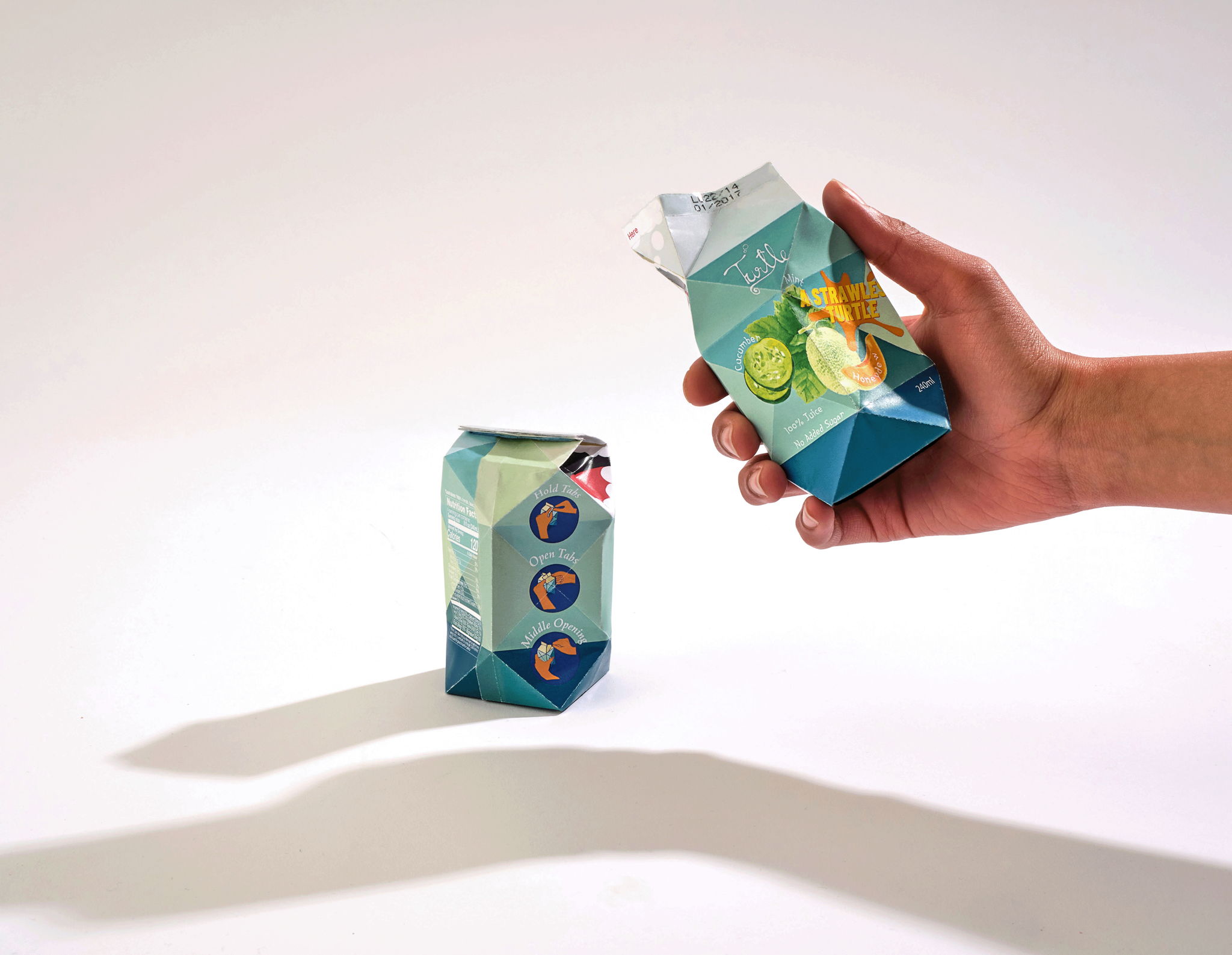 This standard-size drink pack combines origami with drink packaging to create strawless packaging. Its triangular folds colored in shades of ocean greens and blues, look like the shell back of a turtle.
