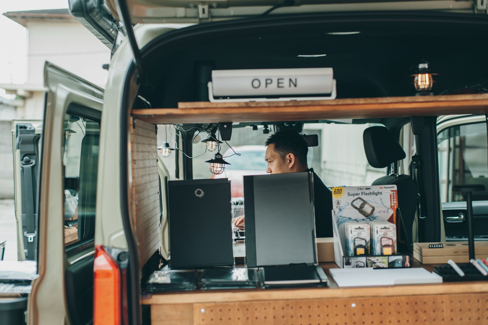 軽自動車をカスタムし、助手席側にはカウンター、リアゲート側にも商品陳列スペースを備えています