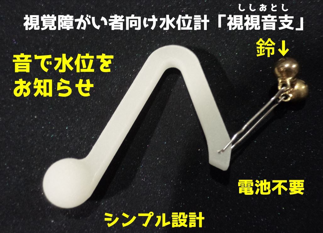 このような視覚障がいの方々が抱える問題を解決するために、視覚障がい者向け水位計「視視音支(ししおとし)」を発明いたしました。