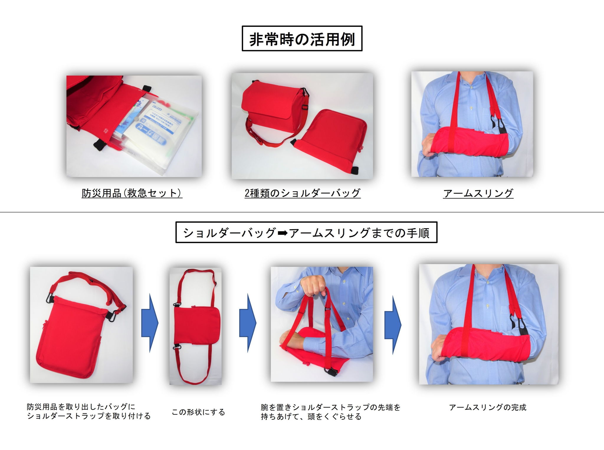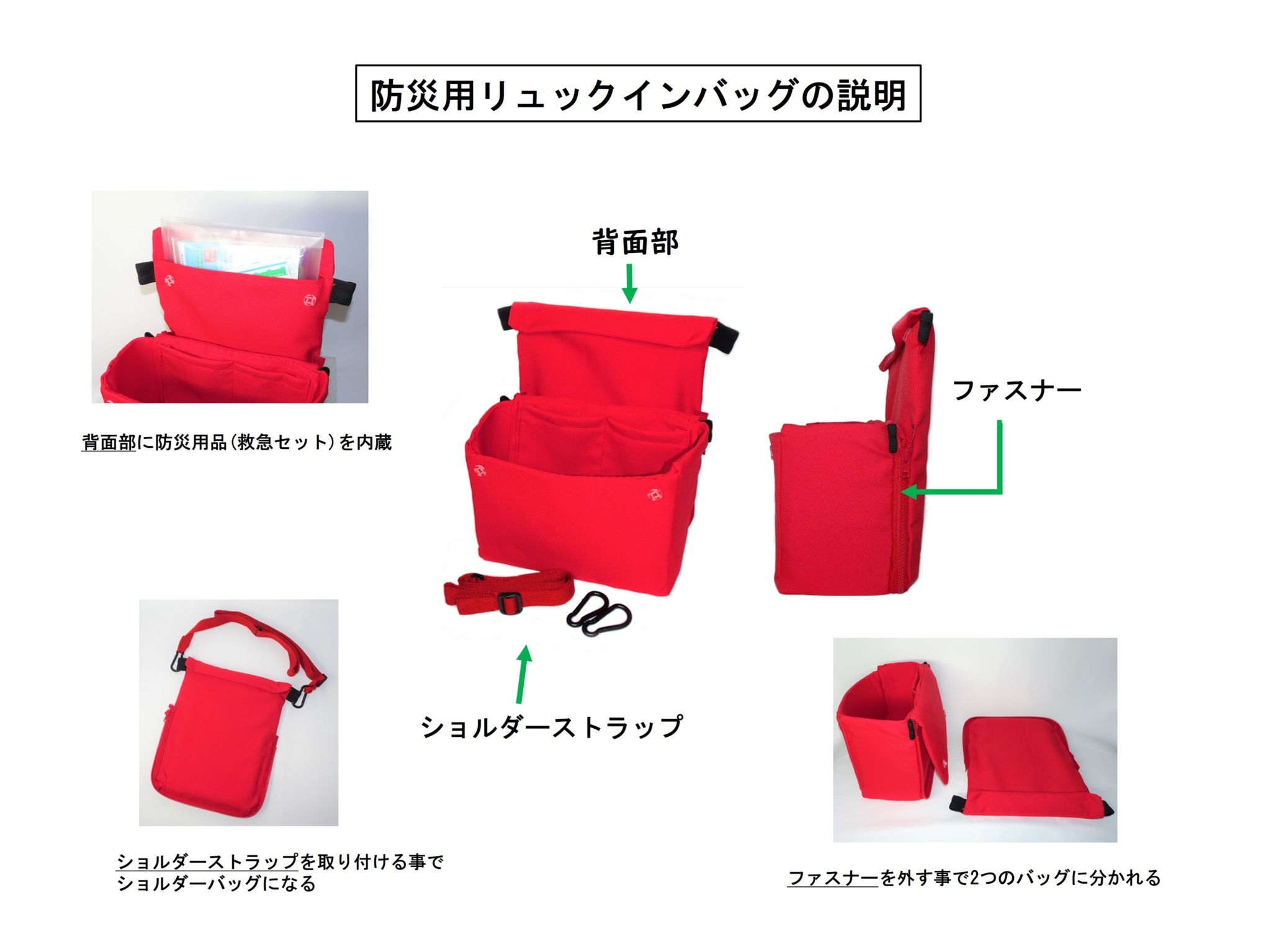 日常・非常時どちらでも活躍する防災用リュックインバッグ。本来の機能に加え、非常時に必要な防災用品が背面部に内蔵されており、非常時の時に必要な物を素早く取り出せ初期対応が可能になる。ファスナーを外すと2つのバッグに分かれ、付属してあるショルダーストラップを取り付けることでショルダーバッグとして使用できる。これにより、持ち運ぶ量を増やすことができ、非常時に増えてしまった荷物があっても持ち運べるようになる。また、腕を怪我した際にはショルダーバッグをアームスリングとして使用できる。これにより、日常は、リュックインバッグとして使用し、非常時には防災用品袋、ショルダーバッグ、アームスリングと3つの用途として使用できるリュックインバッグとなっている。